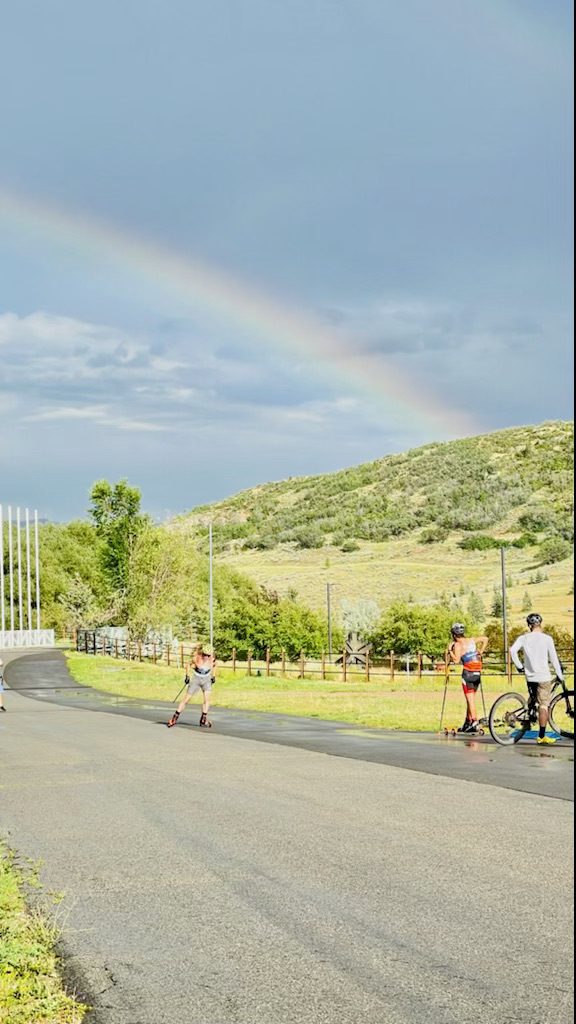 Saturday was the culmination of roller skis at Soldier Hollow (SOHO) under a double rainbow. It was the third of three days of rainy competition. However, the rain delays merely provided further opportunity for the families to hang out together as Springer can feel as much like a national family reunion than any cutthroat competition. The rain served as a bonus slip-and-slide on the running race obstacle course.