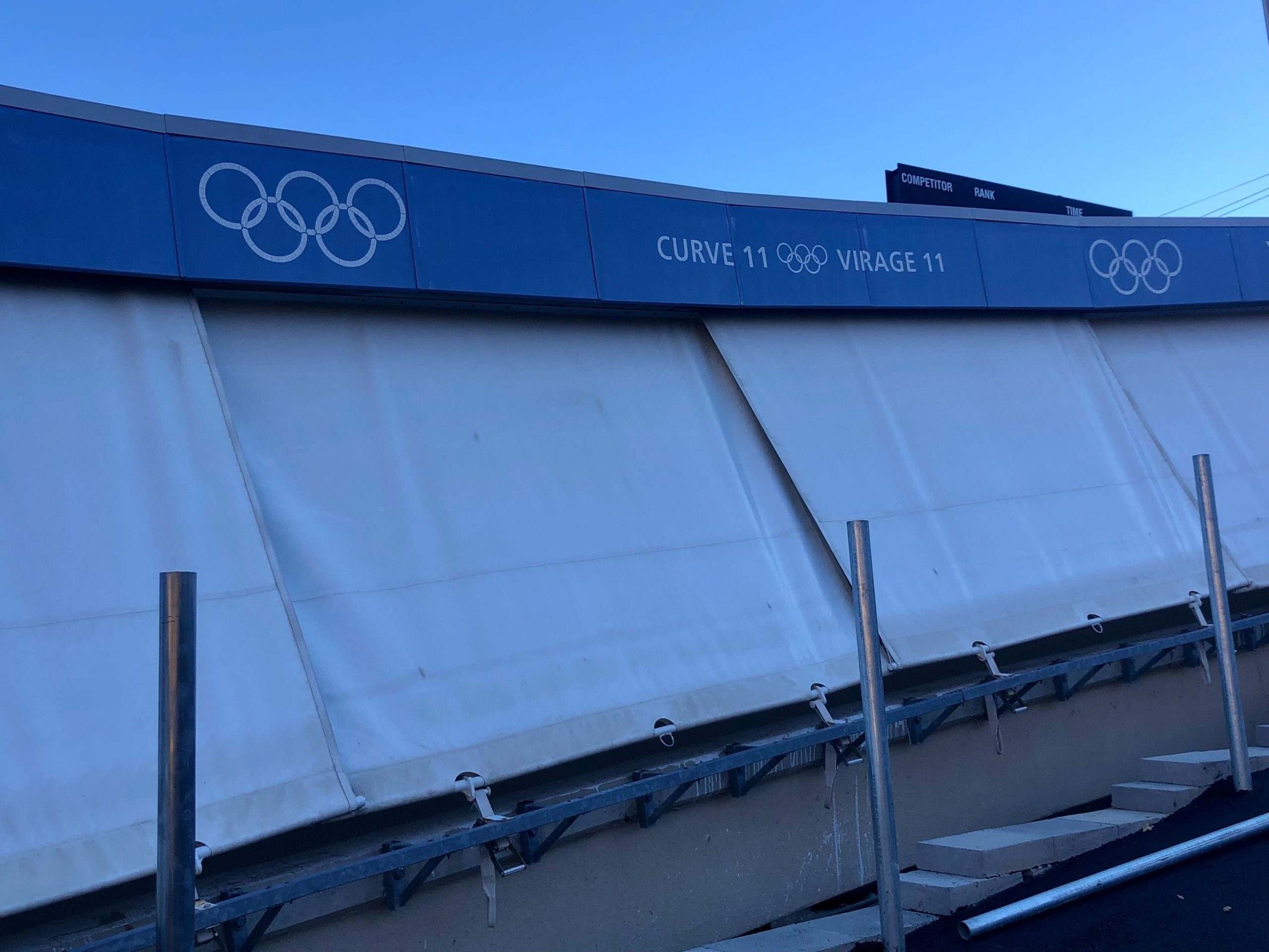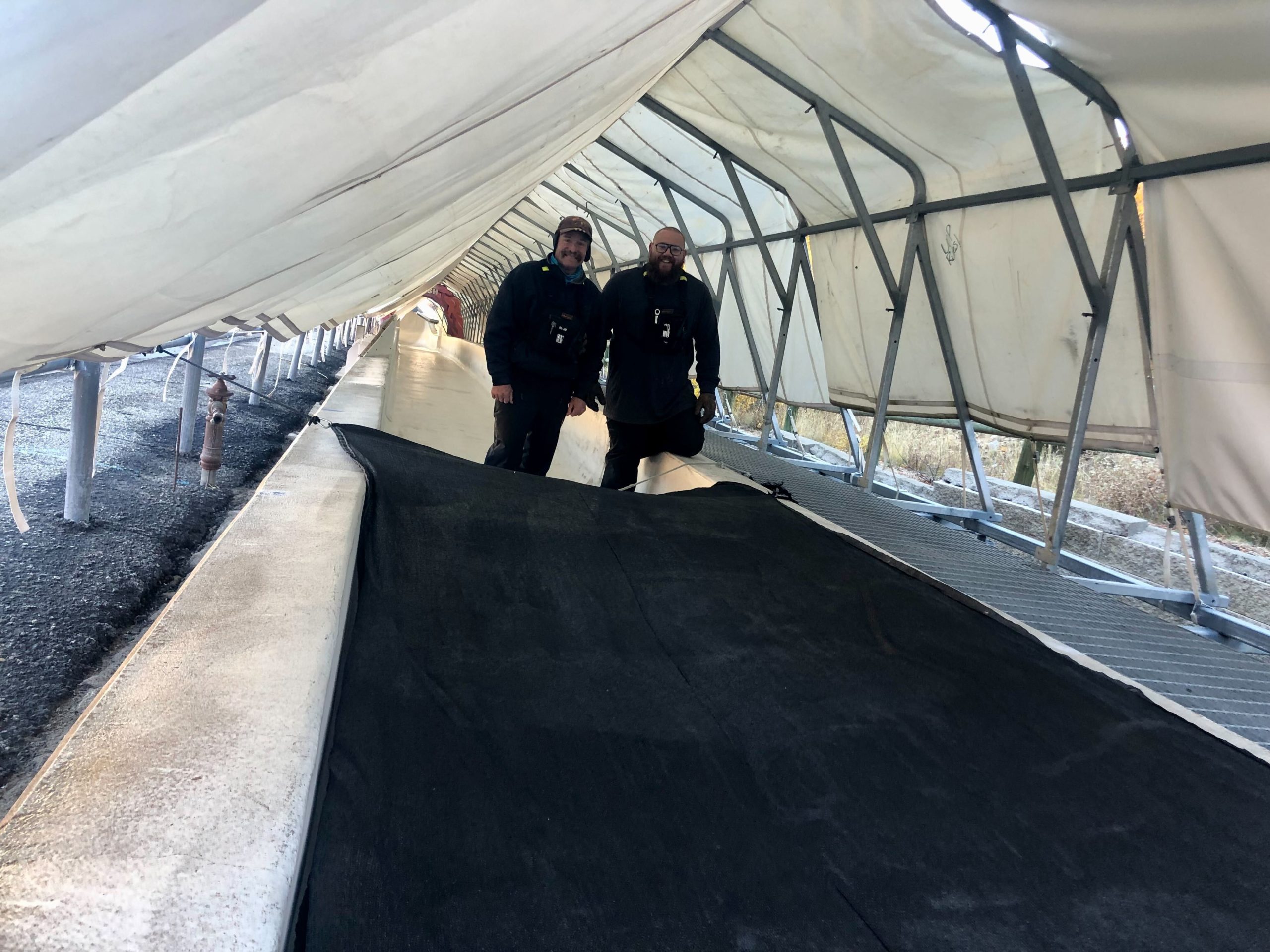 Track crew constantly, manually pulls down and raises up an elaborate system of shades which serves to not only shield the 15-curve track from direct sunlight as the sun moves across the sky but to shield it from snowfall too.