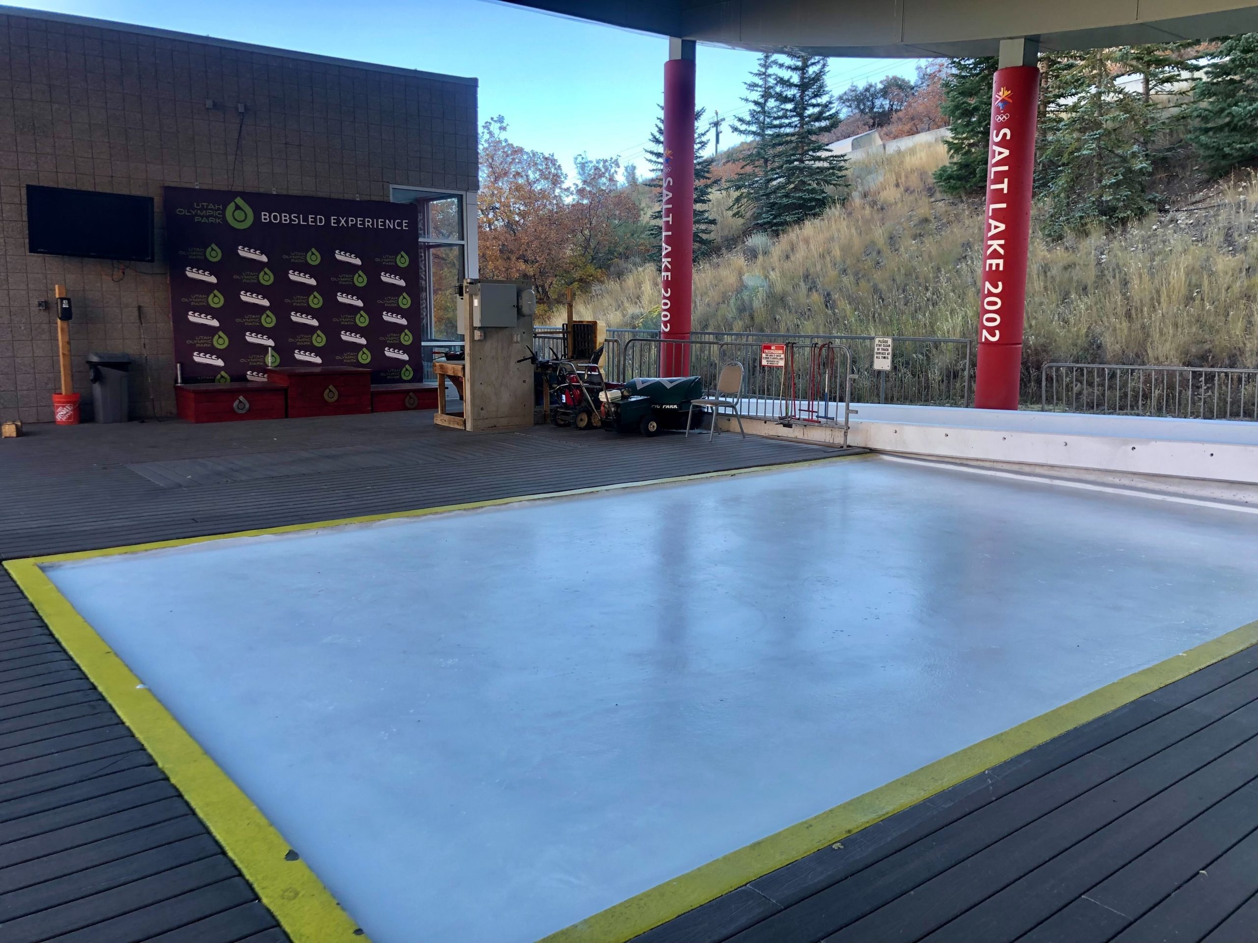 The Refrigerator Plant Supervisor is Gail Day. The two women work with the track crew to monitor and adjust hundreds of temperature readings derived from the three closed-circuit weather stations located at the track. The track crew will wear waterproof clothes and boots every day from now until April, when they flip the switch to OFF, and the ice simply melts for the summer. They also wear crampons or creepers on their feet, the metal spikes providing traction. The hazmat-certified crew works closely with the Park City Fire District to ensure safety to steer all of the track policies and procedures.