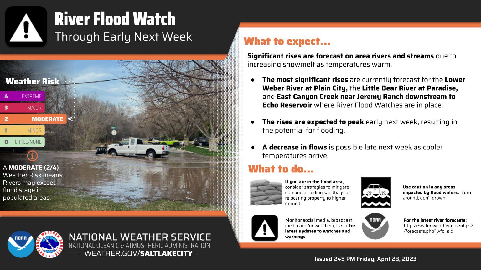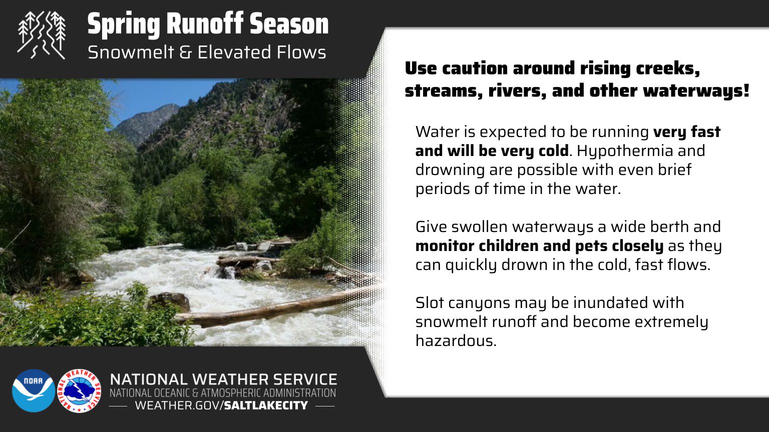 The National Weather Service(NWS) has issued a formal flood watch for the weekend at East Canyon Creek near Jeremy Ranch all the way downstream to Echo Reservoir. Lower Weber River at Plain City and Little Bear River at Paradise are two other areas mentioned in the announcement. NWS also advises that the public use caution near rising creeks, streams, rivers, and other waterways. Beyond the risk of drowning, hypothermia danger is significant, with the water being frigid.
