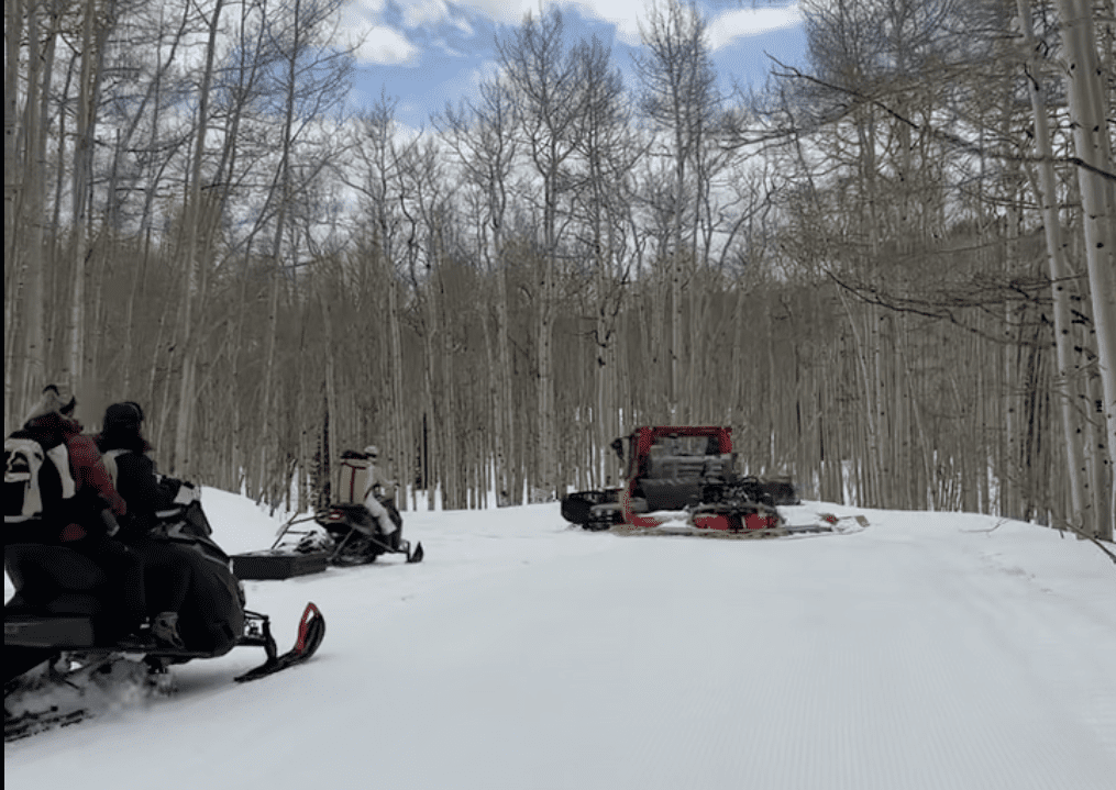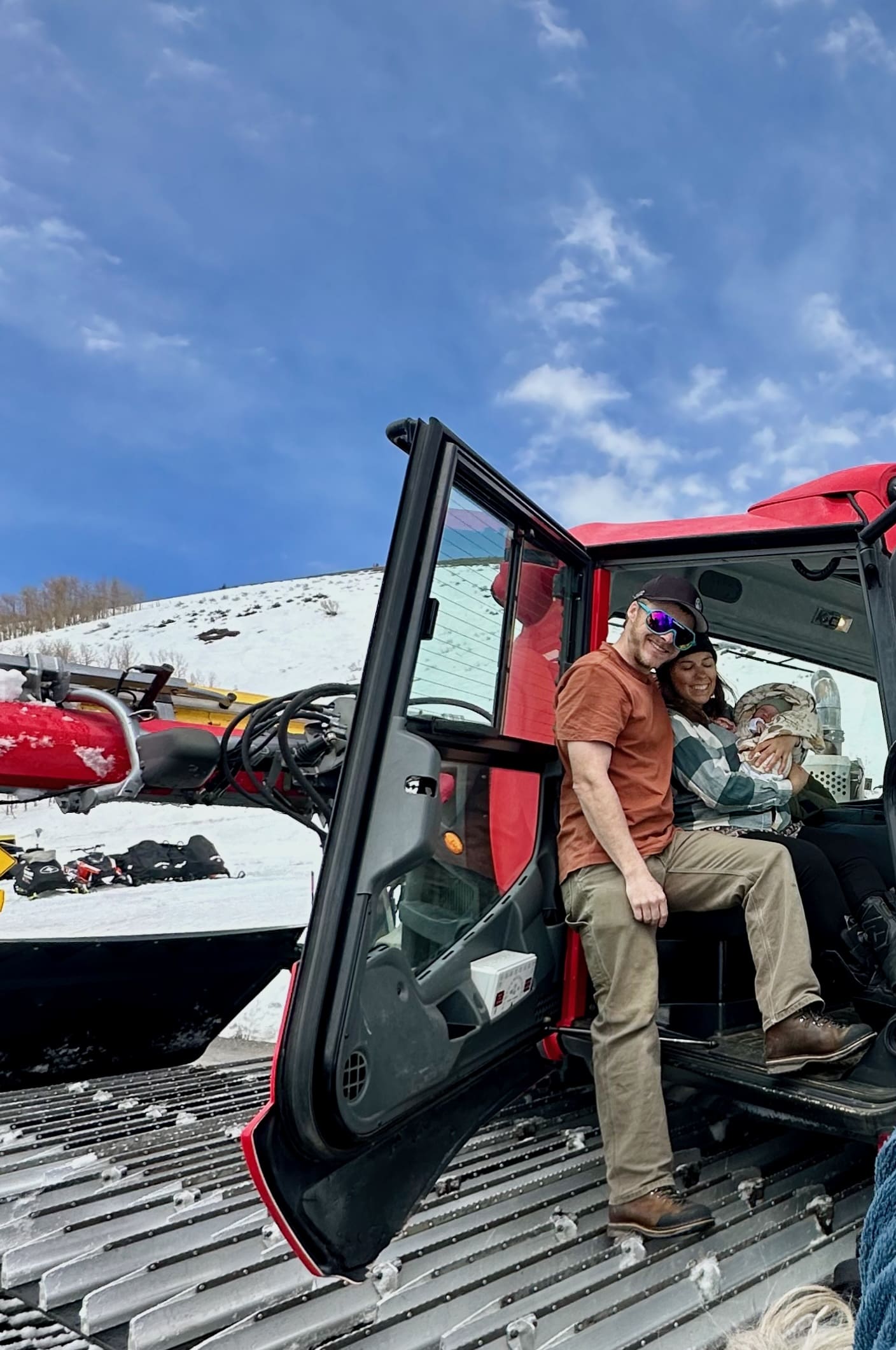 Torin Ray Benner-Campbell and his parents, Kayleigh & Stuart Benner, ready for their first snowcat ride as a family of three. Photo courtesy: Katie Eldridge