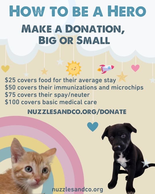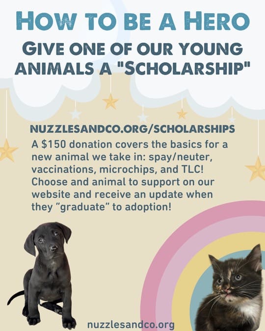 The “opportunity drawing” prizes include a luxurious spa basket, a training clicker, candy, a Nuzzles umbrella, discounts on merchandise, and discounts on adoptions. Guests can also donate to Nuzzles & Co. by making a scholarship donation of $150. This donation will help cover the basics of Nuzzles & Co.’s mission, which provides essential care and support for homeless and at-risk animals.