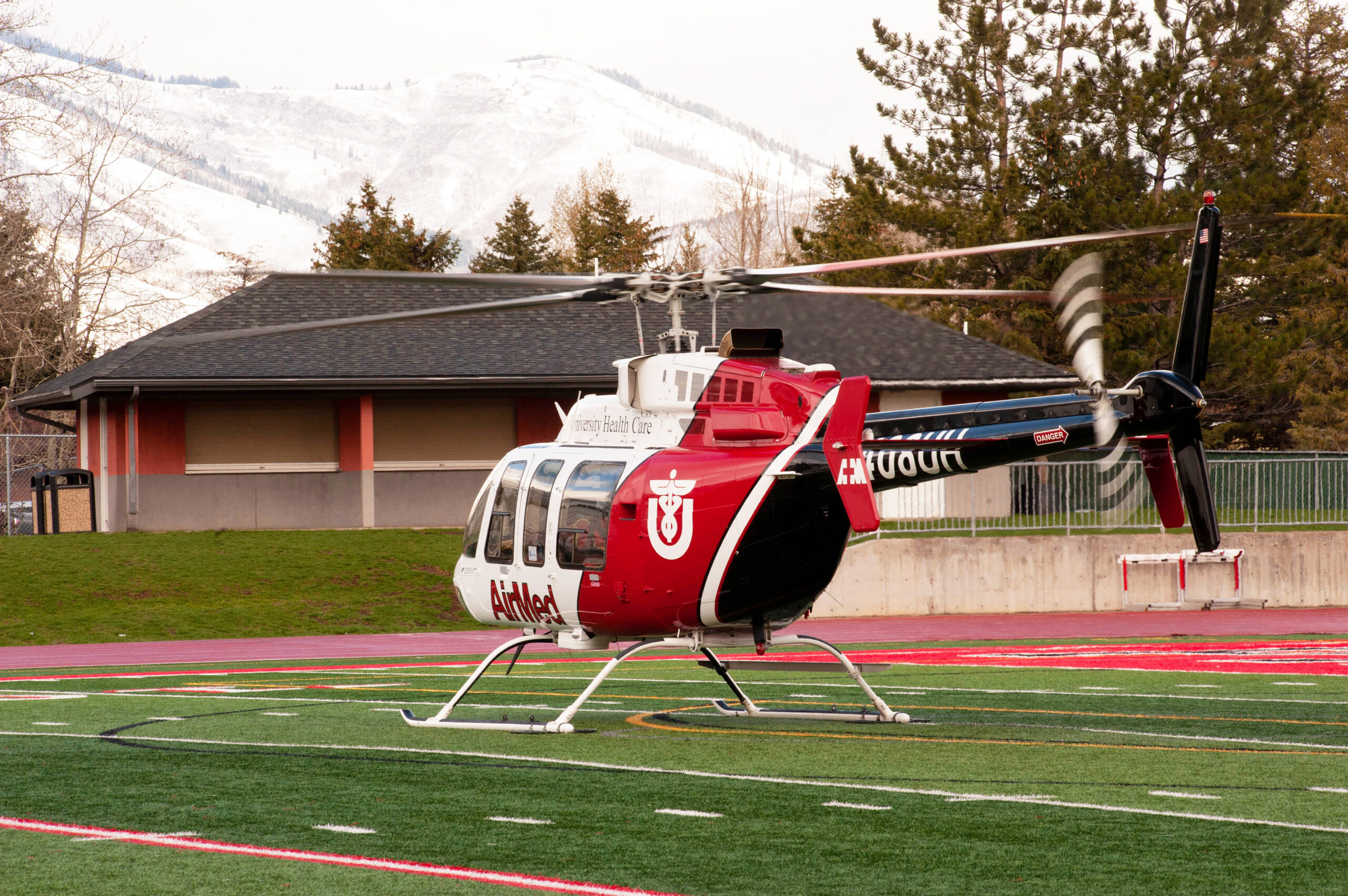 A Univsersity of Utah AirMed helicopter lands on Dozier Field at PCHS as a part of Careers over Coffee, May 3, 2024. Photo: TownLift // Randi Sidman-Moore