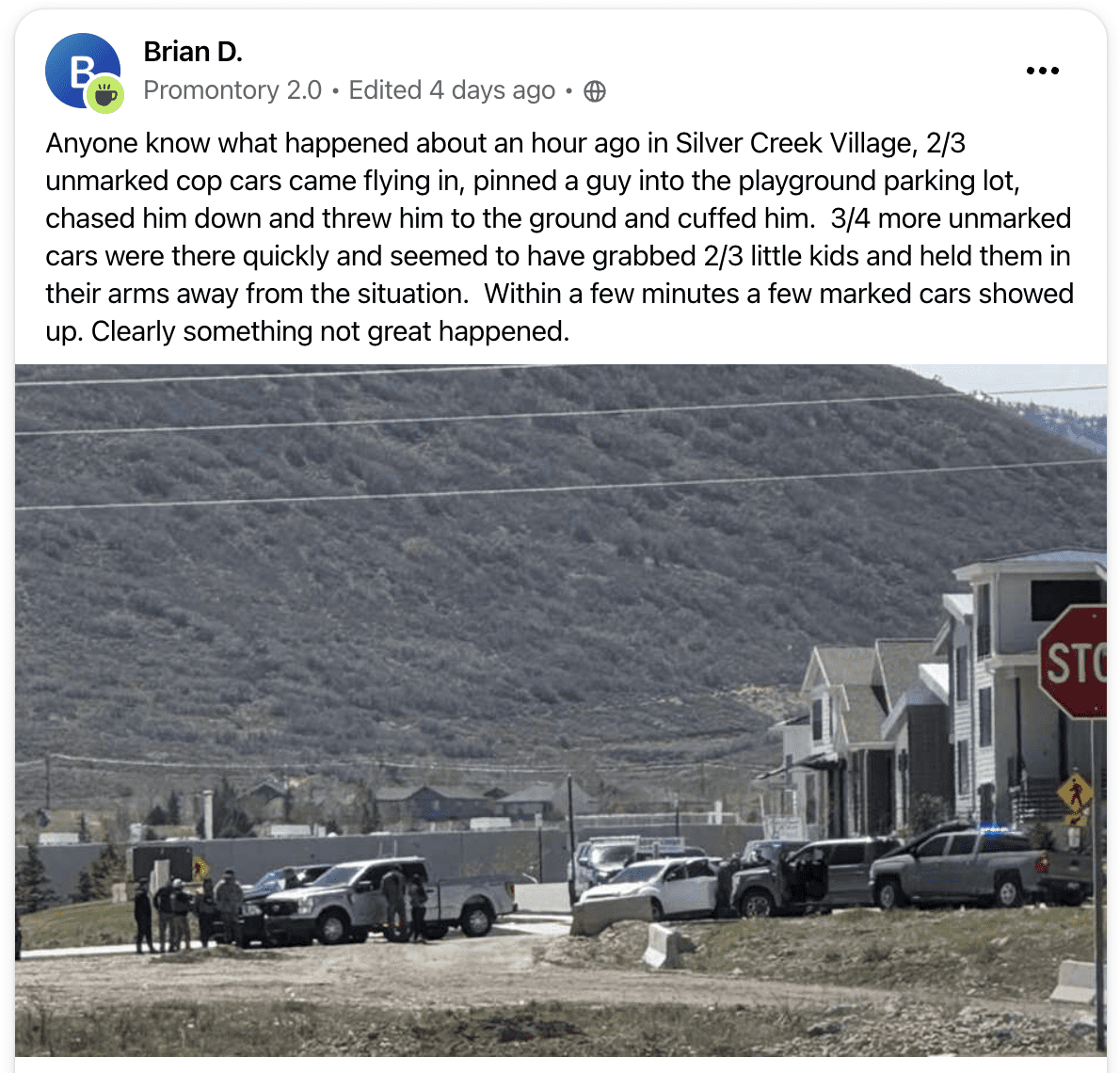 A post on NextDoor described the incident: “2/3 unmarked cop cars came flying in, pinned a guy into the playground parking lot, chased him down and threw him to the ground and cuffed him. 3/4 more unmarked cars were there quickly and seemed to have grabbed 2/3 little kids and held them in their arms away from the situation.”