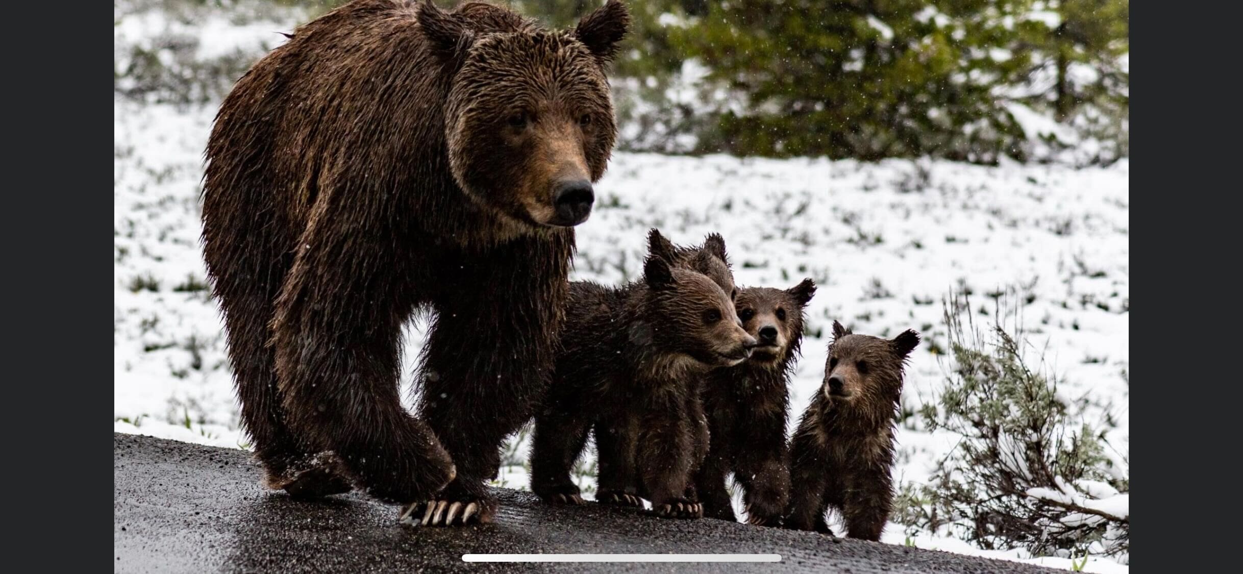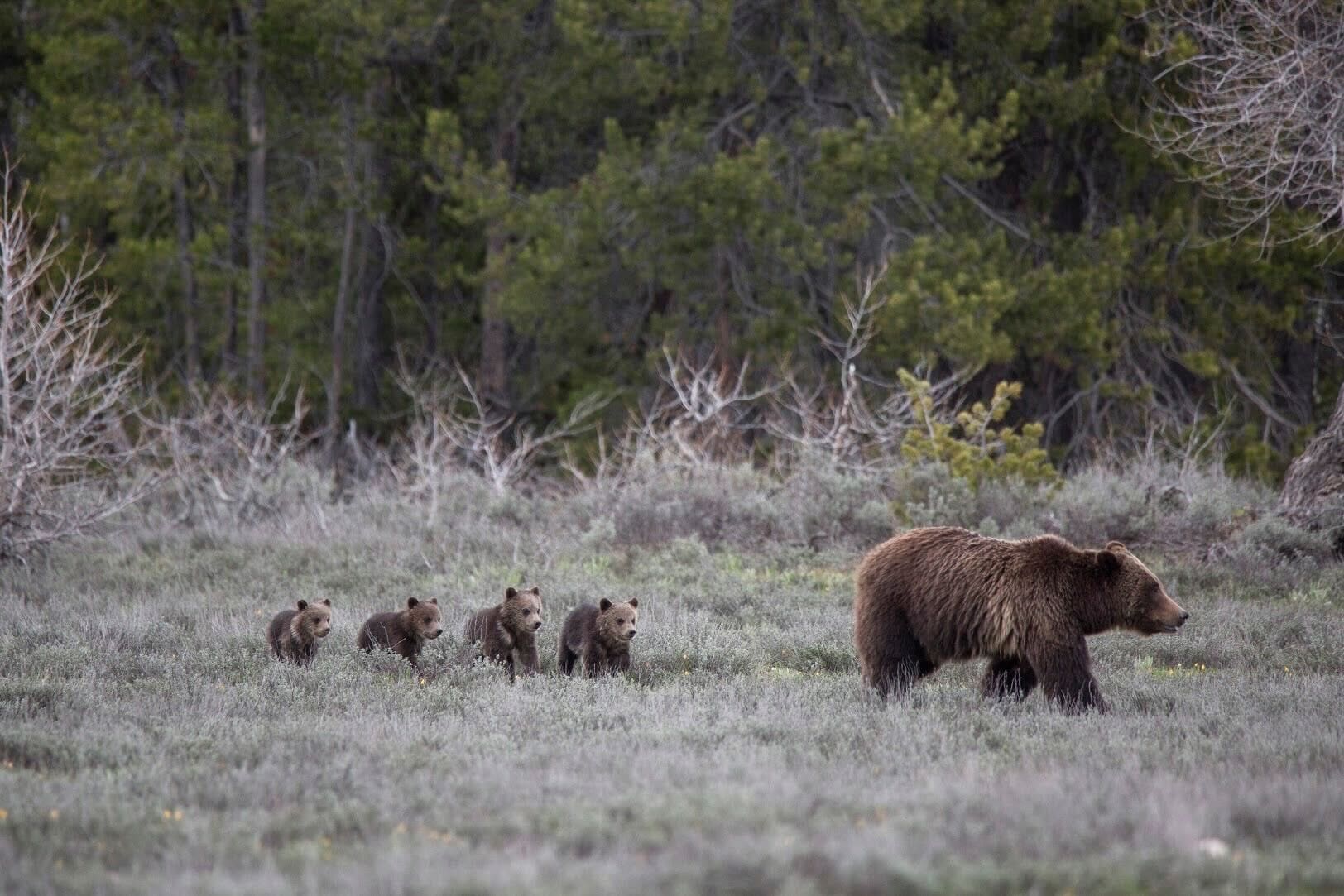 Grizzly bear 399 with three oof the four cubs she birthed in 2020. 399 was killed by a car Tuesday, Oct. 22, 2024. Photo: Wikimedia commons