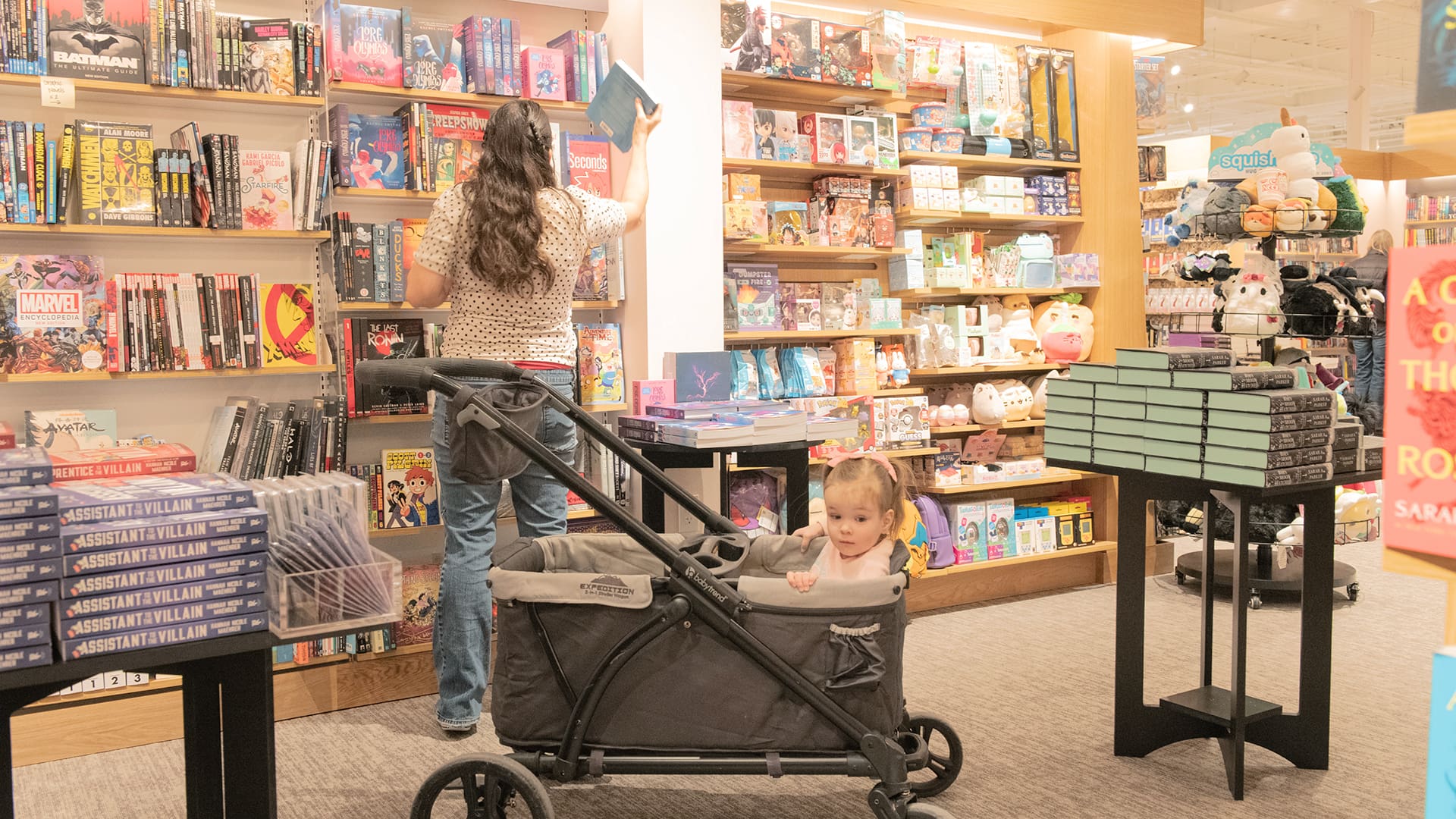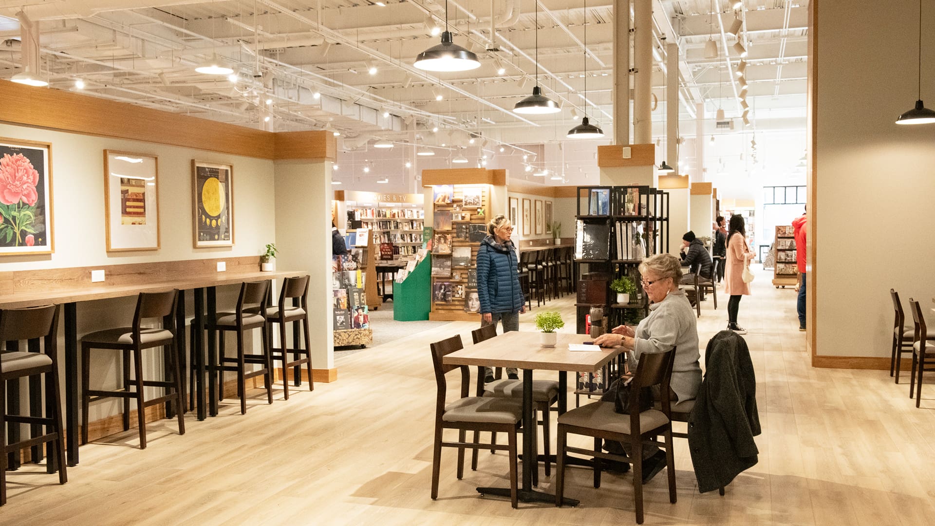 The store replaces the former Bed Bath & Beyond location and features a modern layout with books, toys, games, and an updated B&N Café.