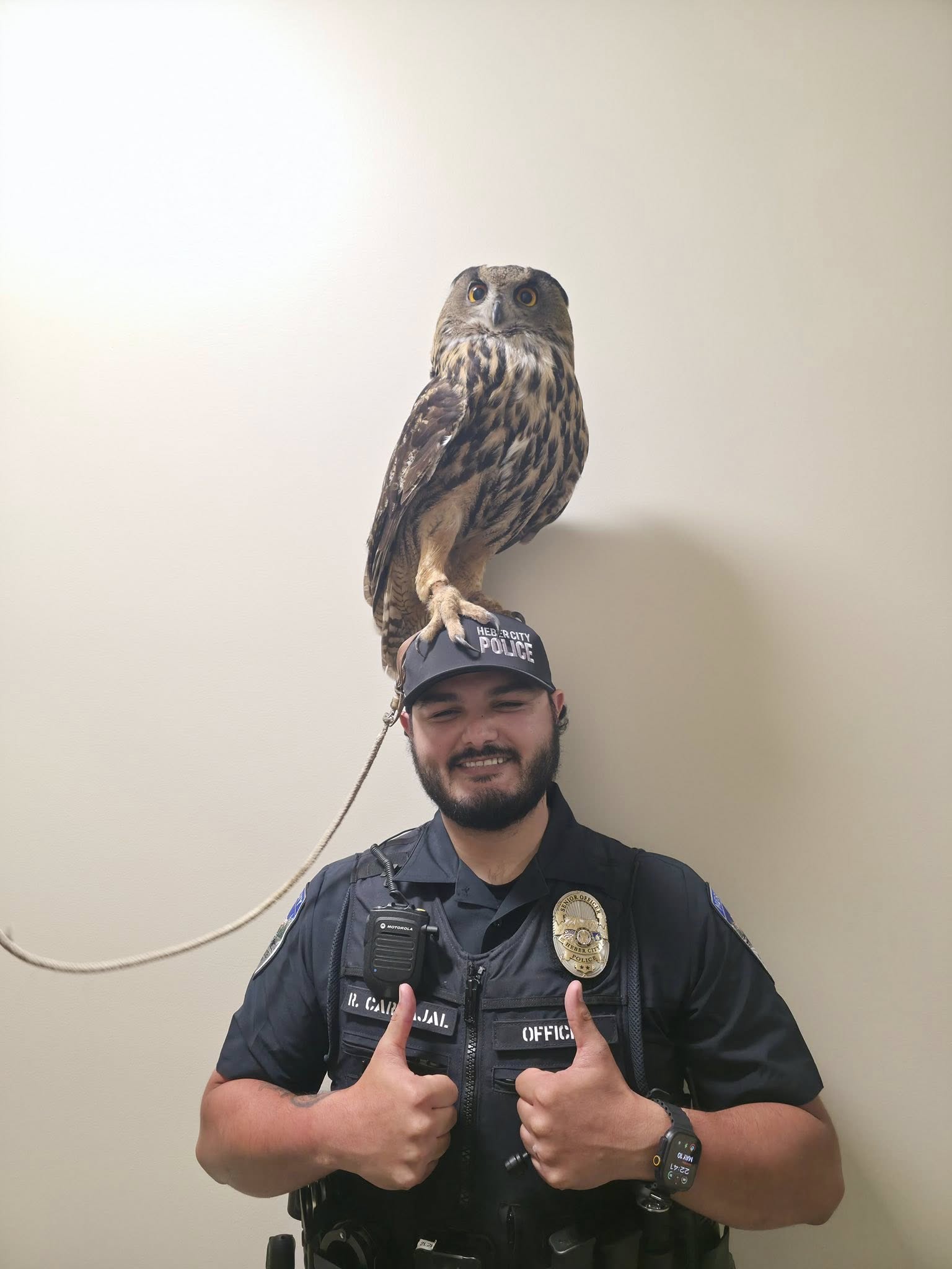 On Sunday, May 11, the Heber City Police Department spent time with the Hollywood star Hoot and handler Jeff Shelburg. Sergeants and Officers were able to take photos with and get up close and personal with Hoot.
