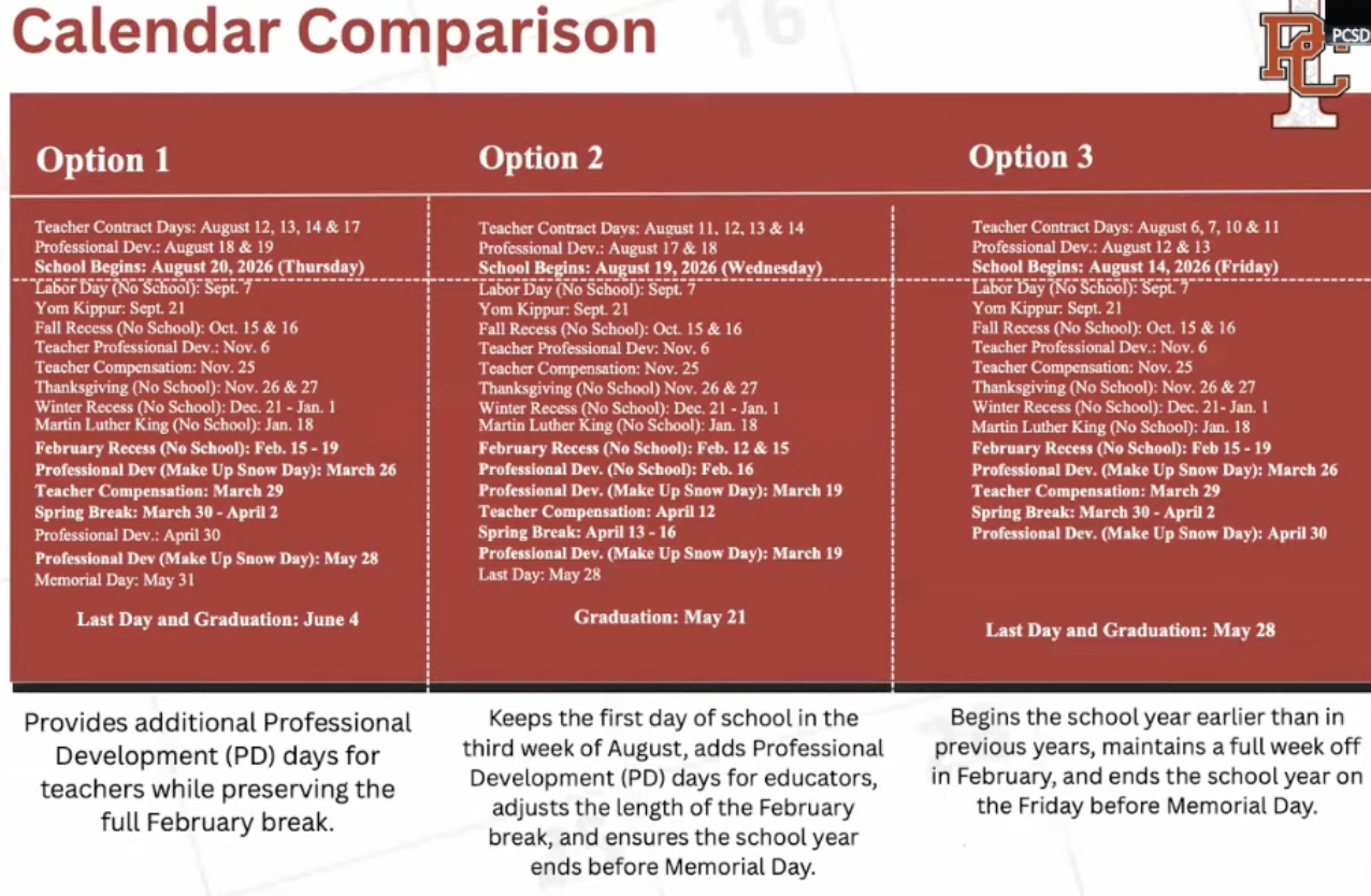 The board will vote on a refined version of Option 1 in November. District officials plan to establish a three-year calendar to help families plan major trips and commitments well in advance. “We have families planning trips for next fall already, and they want to know what the calendar will look like,” Huntsman said.