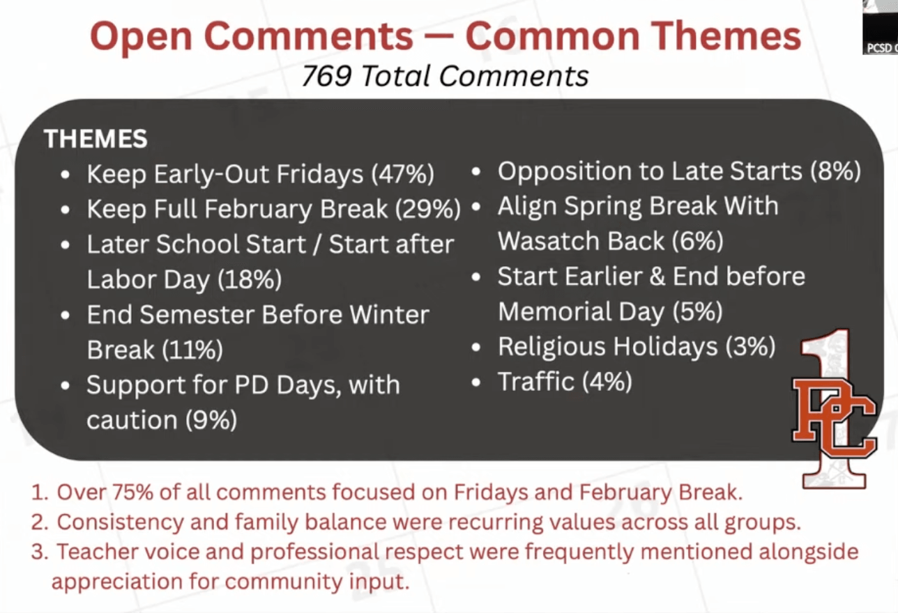 The survey also revealed complications in calendar planning beyond simple start and end dates. Some comments highlighted conflicts with major community events; this year, a professional development day unintentionally coincided with the Park City Community Foundation’s annual Live PC Give PC fundraising event. “Please don’t schedule a professional development day on the Friday of Live PC Give PC,” Huntsman said, summarizing community feedback. “Students are out of school, but teachers are in professional development while the event is happening.”