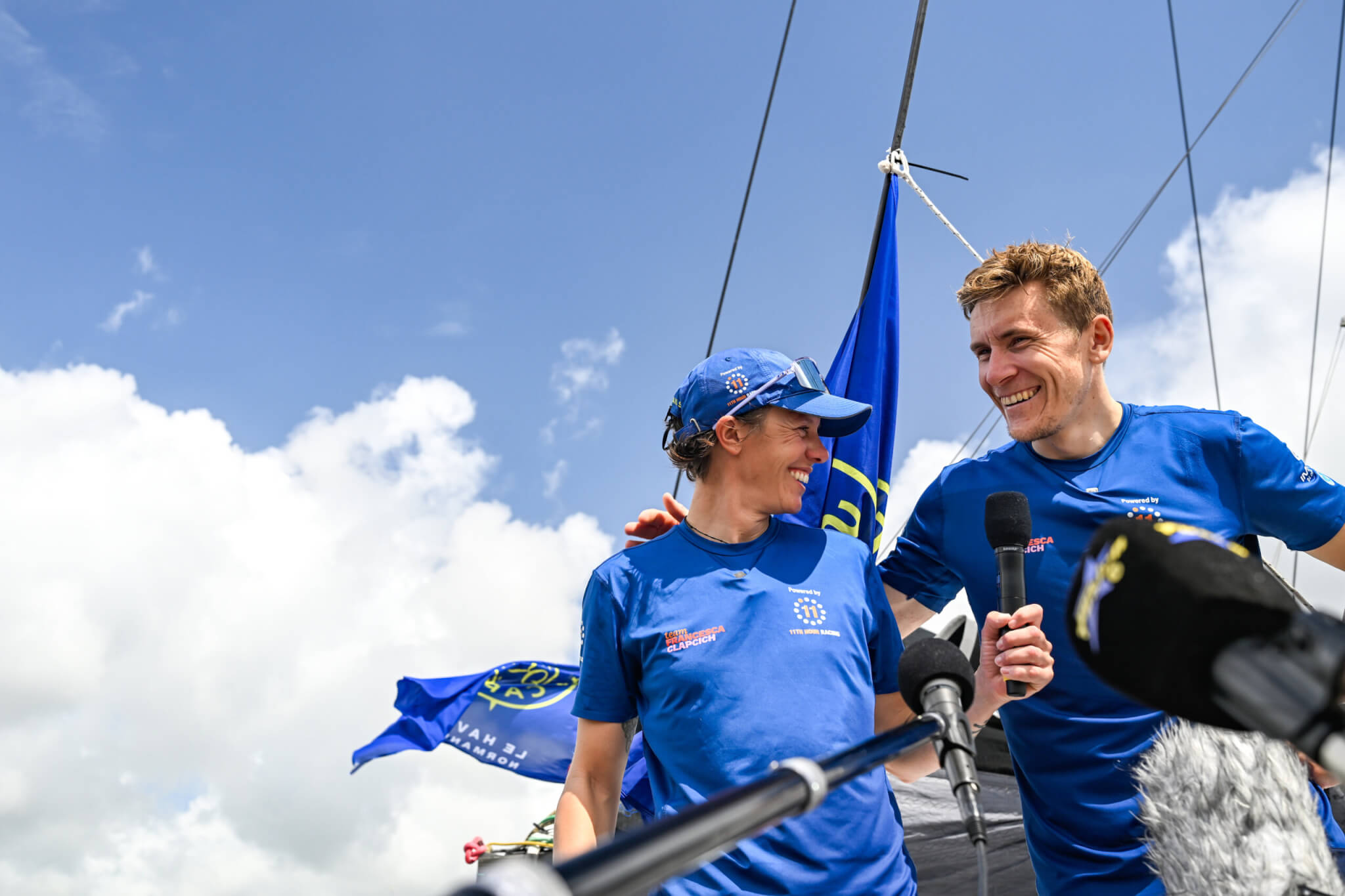 Skippers Will Harris and Francesca Clapcich celebrate aboard 11th Hour Racing after finishing second in the Transat Café L’OR on Friday in Fort-de-France, Martinique. The duo’s podium finish marked the best IMOCA result for a non-French team since 2011 and the highest finish by a woman in the class in two decades. Photo: Transat Café l’Or 2025