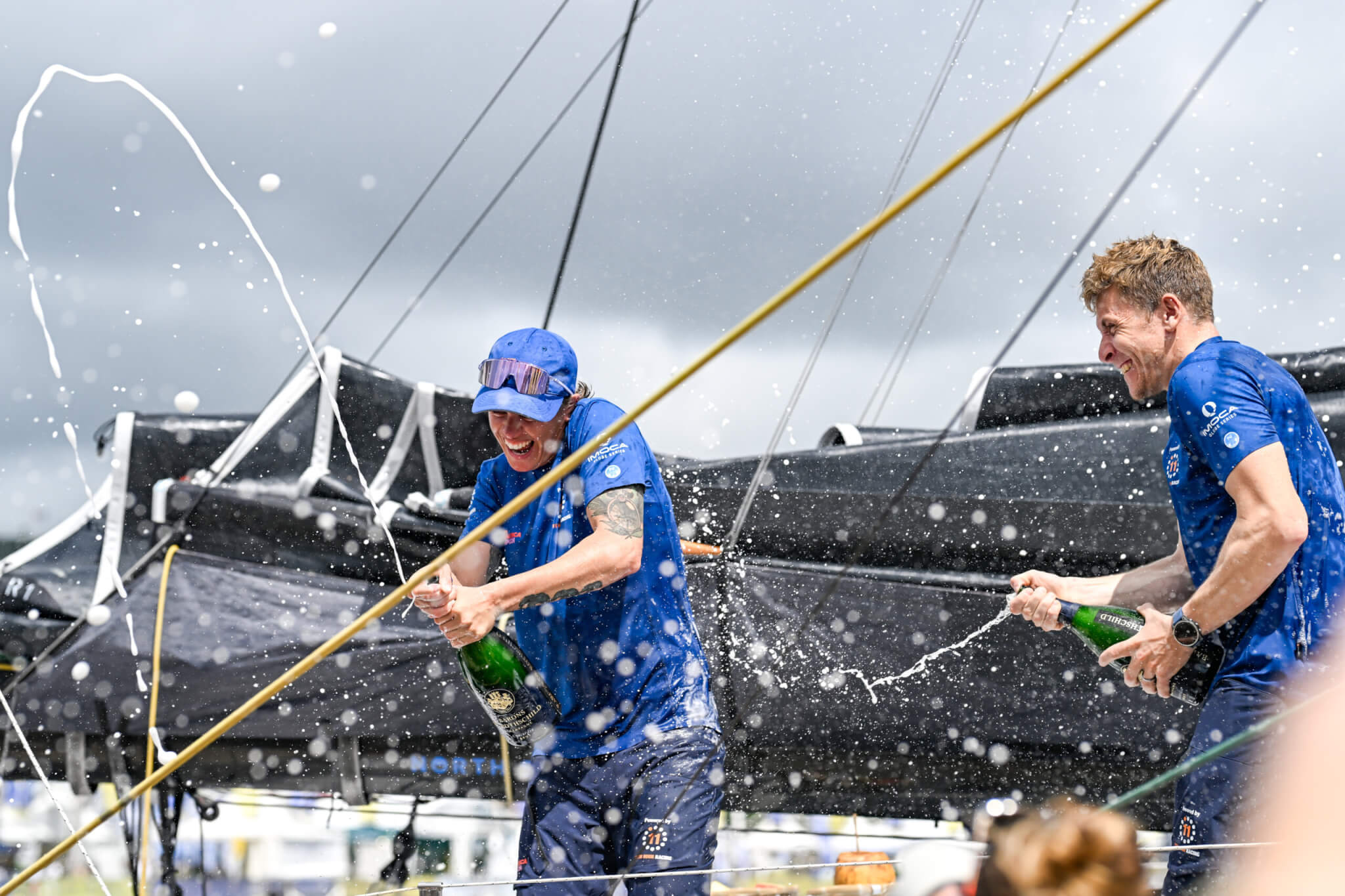 Francesca Clapcich and Will Harris celebrate with champagne after crossing the finish line in Fort-de-France, Martinique. The 11th Hour Racing duo secured second place in the Transat Café L’OR, marking a standout performance in the demanding transatlantic race. Photo: Jean-Louis Carli / Alea