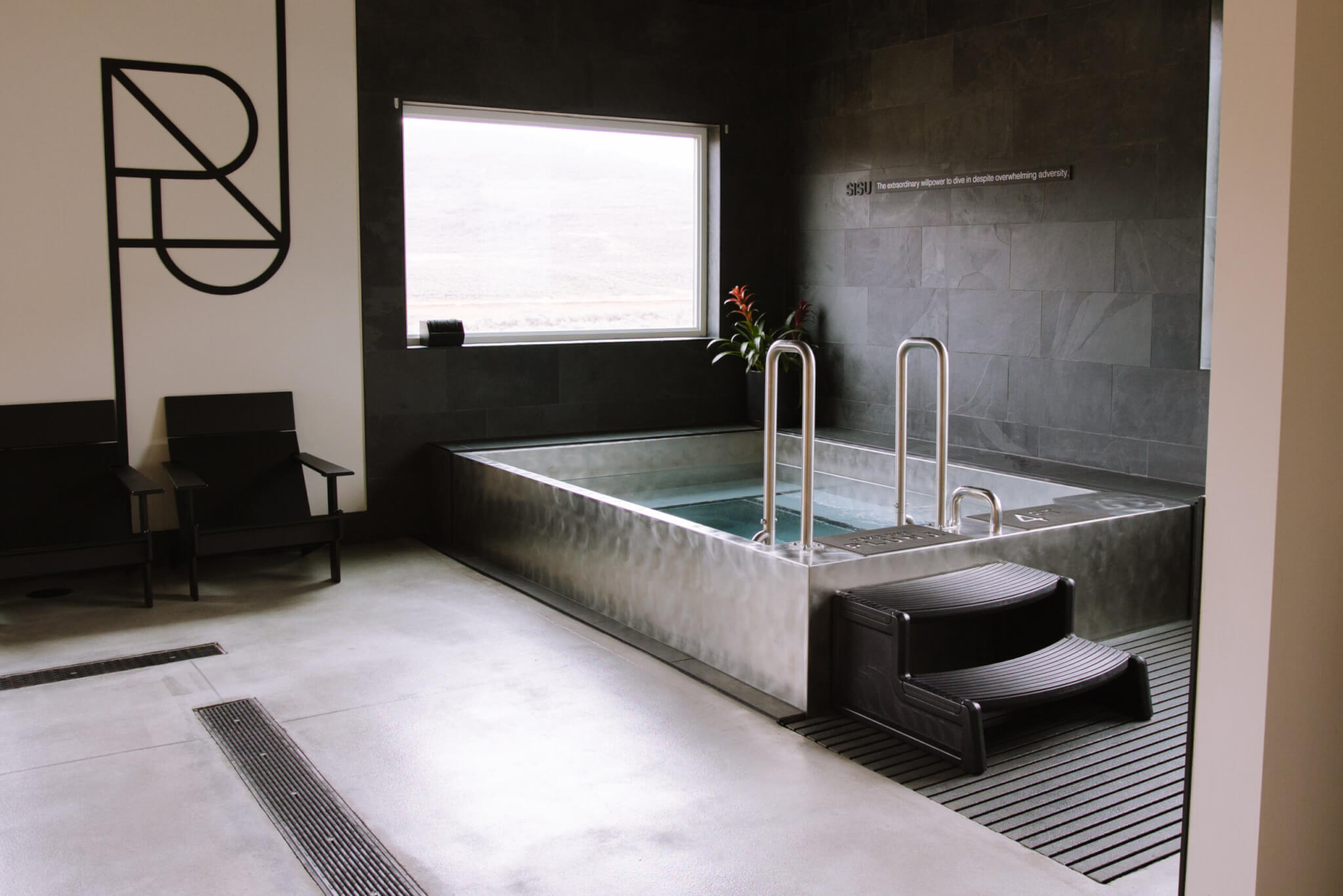A view from inside PLUNJ Park City’s bathhouse, where the cold plunge sits beneath a frosted window bearing the studio’s name. The minimalist space reflects the Nordic-inspired simplicity of the hot–cold–rest ritual central to the PLUNJ experience. Photo: PLUNJ Park City