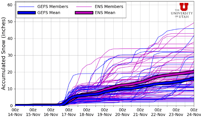 Photo: Utah Snow Ensemble model total snowfall through Monday // UofU Dept. of Atmos. Sciences