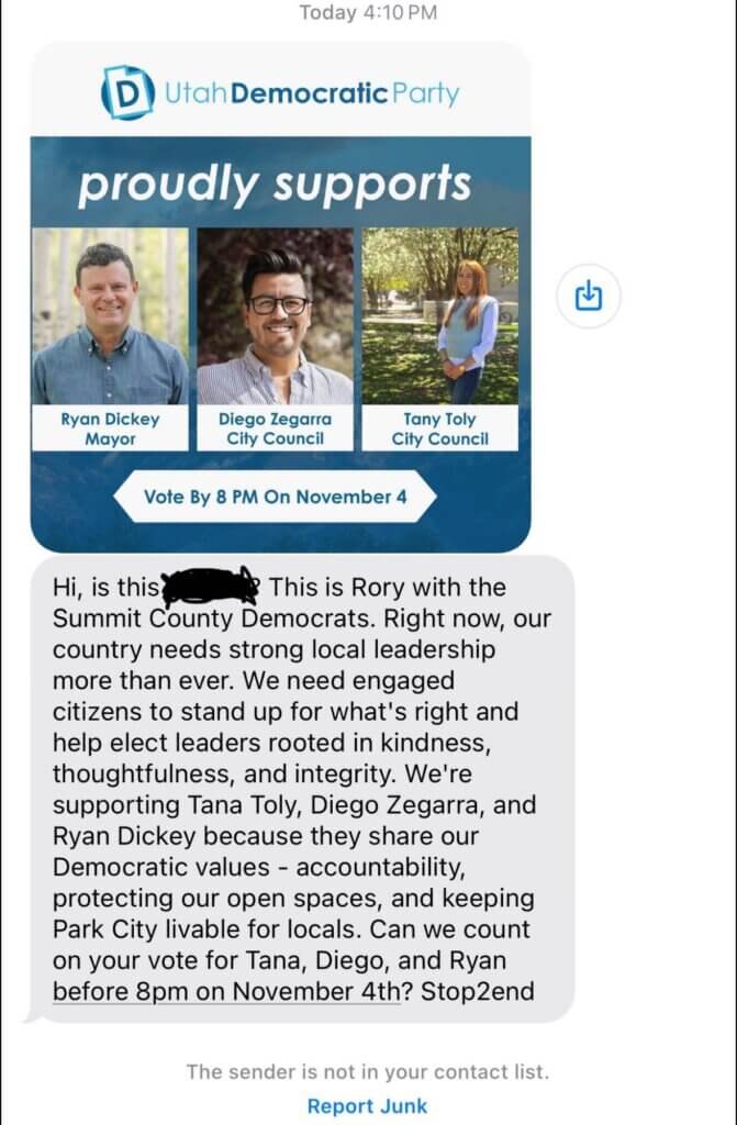 Monday’s text follows an earlier October 14 message sent by the Utah Democratic Party and Summit County Democrats, which endorsed Tana Toly, Diego Zegarra, and Ryan Dickey. That message was properly labeled and attributed to local party leadership. Swensen said it was paid for by the Utah Democratic Party and was targeted as a “get-out-and-vote” message.