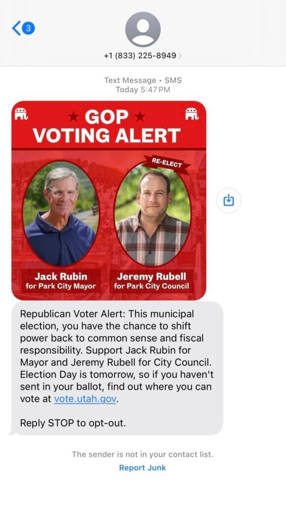 PARK CITY, Utah — A mysterious text message that appeared to endorse two Park City municipal candidates under the banner “GOP Voting Alert” sparked confusion and frustration on the eve of Tuesday’s election — and now both local party leaders are calling for an investigation.