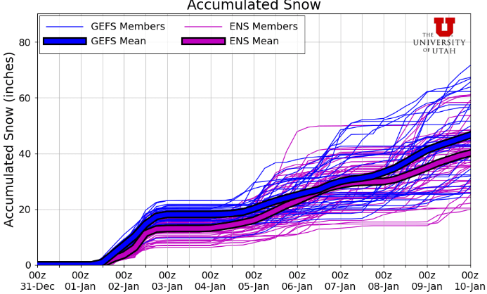 Snowfall should remain fairly consistent from early New Year’s Day through the afternoon, before a second wave comes in overnight Friday and into the morning as the center of the low tracks across central Utah. Snowfall looks to mostly taper off by the afternoon hours Friday. Snow levels will also begin to drop a bit during this later period closer to 7500 feet as the low draws in some colder air with it.