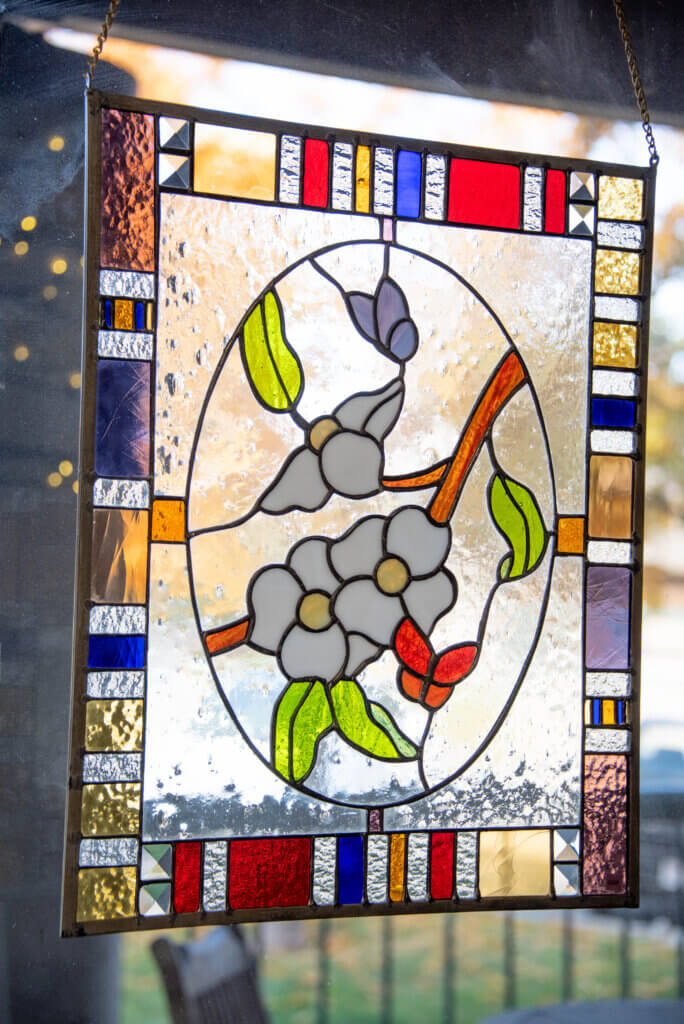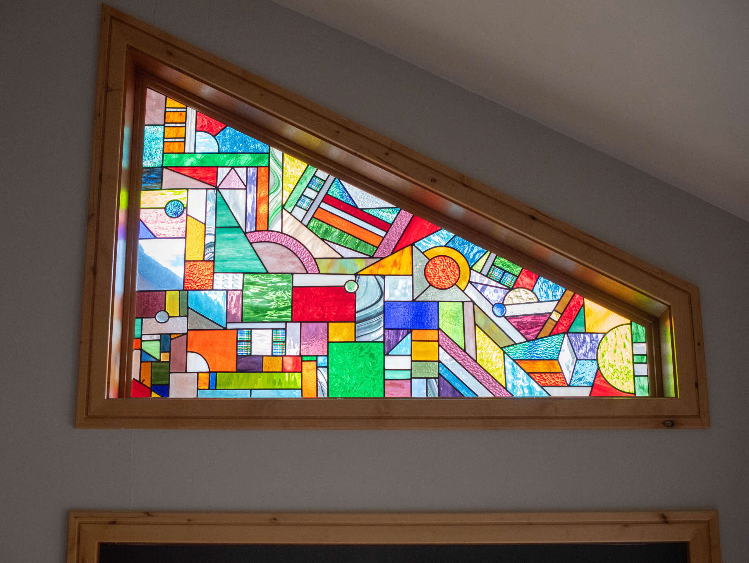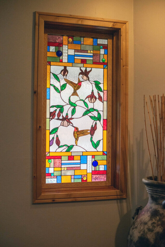 Alongside her dad, Dawn Chapman started working with stained glass in her dad’s garage “glass shop.” After she and her husband built their house in Pinebrook, she discovered three windows with views underneath the deck and the roofline, as well as one that led into a drainage area. Once she realized these would be great for stained glass, she talked to her dad. She collaborated with him on two of those windows, which feature her dad’s hummingbird designs. The second window was a true joint effort, with Dawn’s more abstract art framing her dad’s work. The third, triangular in shape, highlights Dawn’s abstract style.