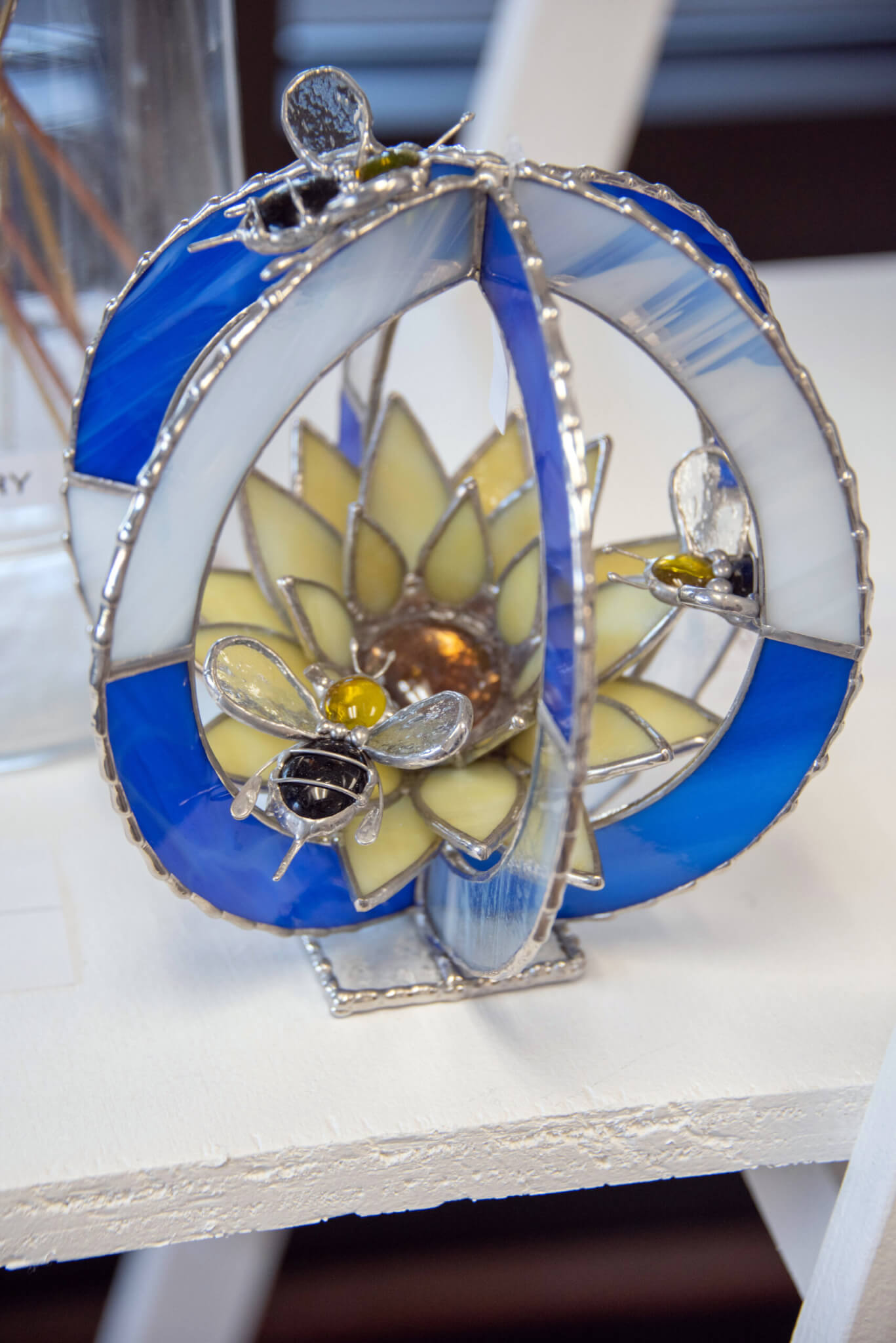 In her daily business, Dawn deals with contracts, houses, and repairs, so when she is in her creative mode in her studio, time just flies. Her art is three-dimensional, also two-dimensional with up to 400 pieces in a single artwork, with many nature-inspired designs. Hiding in the corner of her storage room is plant jewelry, which are sticks with stained-glass designs at the top. Beveled-glass snowflakes, 3D lamps, and myriad holiday designs line the tables. Dawn Chapman is an artist who is known to create in her glass studio five days in a row, but when the muse isn’t inspiring her, she allows herself to take some time off. You can check out her artwork at www.dcglassart.com.