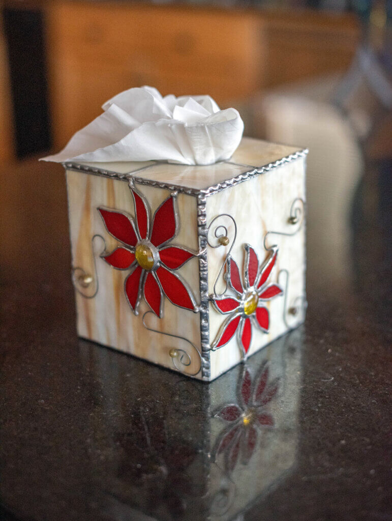 When Dawn decided to pursue stained-glass art on her own, she took some classes to fill in any gaps where her knowledge may have been lacking. Now, she has her dad’s glassworking table in her garage, along with glass stored in a large room by her workshop. Dawn’s first projects were gifts she made for girlfriends; next, she started creating snowflake designs for clients buying or selling their houses. When her husband complained that window space in their home was becoming scarce, she held a sale at her house (which happened to go very well!).