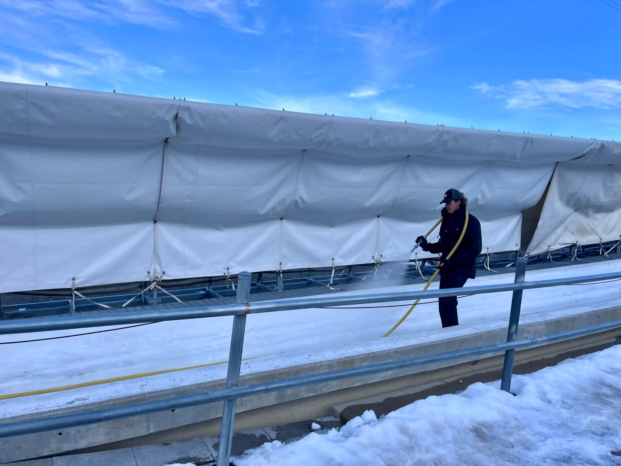 Park City Curling Club Teammate Cody Adams seen here at his day job working on the ice at the Utah Olympic Park during the recent Luge Word Cup. Photo: TownLift // Michele Roepke