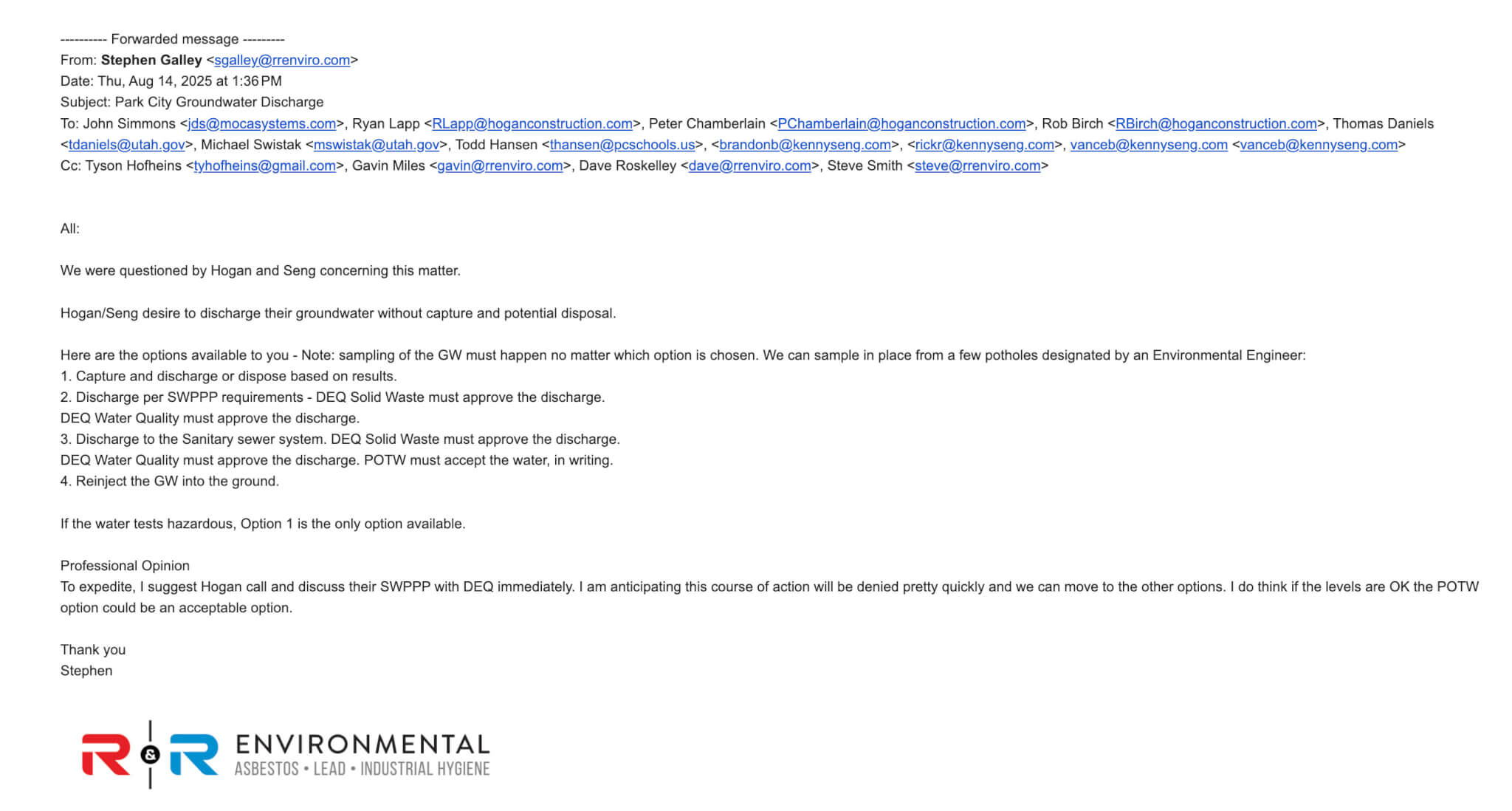 In the Aug. 14 email to Hogan, the district, and project manager MOCA Systems, along with DEQ officials and other contractors, R&R Environmental stated that groundwater sampling was required regardless of the disposal method and advised that the Utah DEQ would “quickly” deny any attempt to discharge groundwater under the project’s SWPPP.