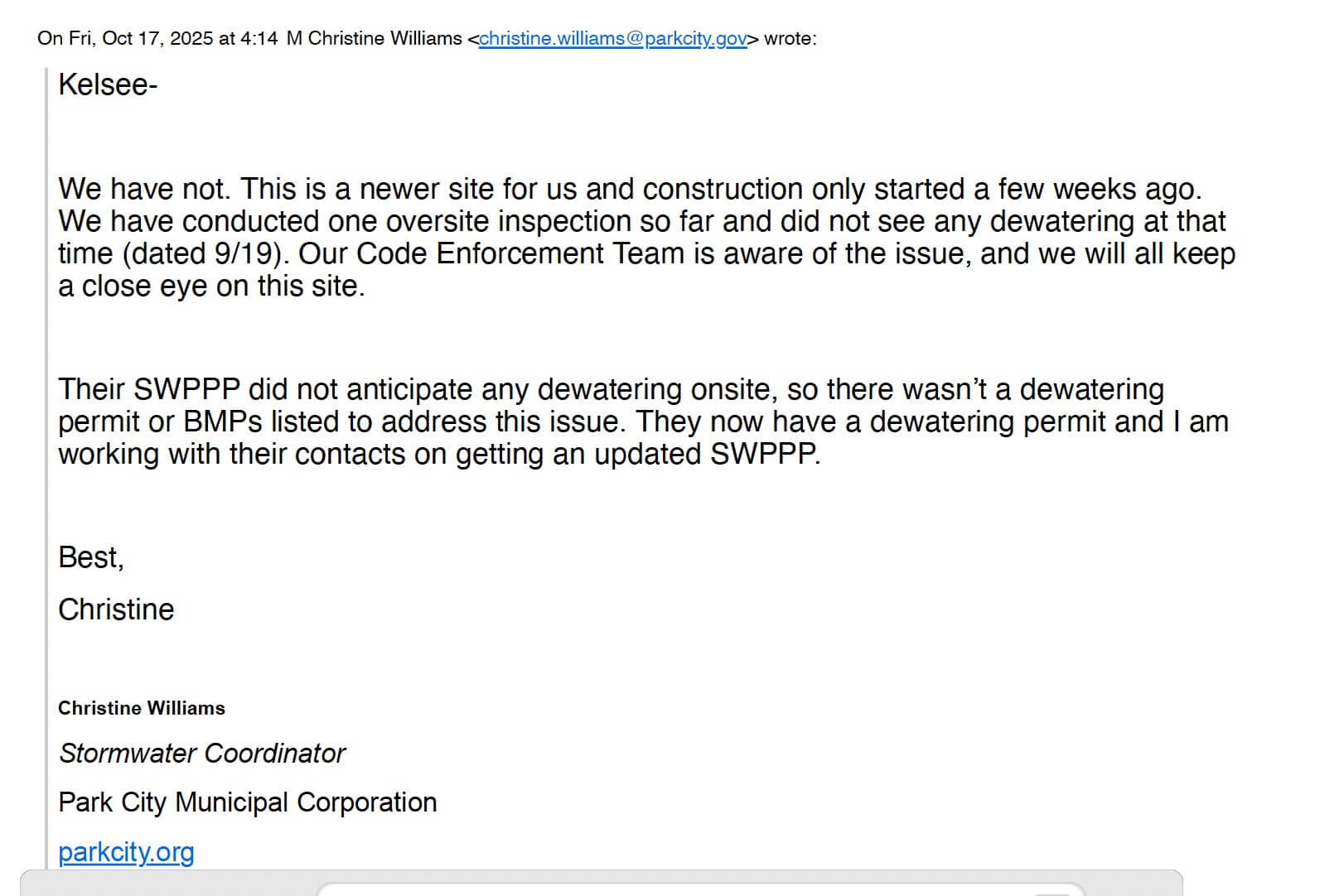 “The SWPPP for this project states that they do not anticipate dewatering and that if it is needed, they will move the water and hold onsite for evaporation. They do not have a dewatering permit.” Christine Williams, Storm water coordinator for Park City Municipal, wrote in an Oct. 13 email to city colleagues, after the spill was reported to the DEQ.