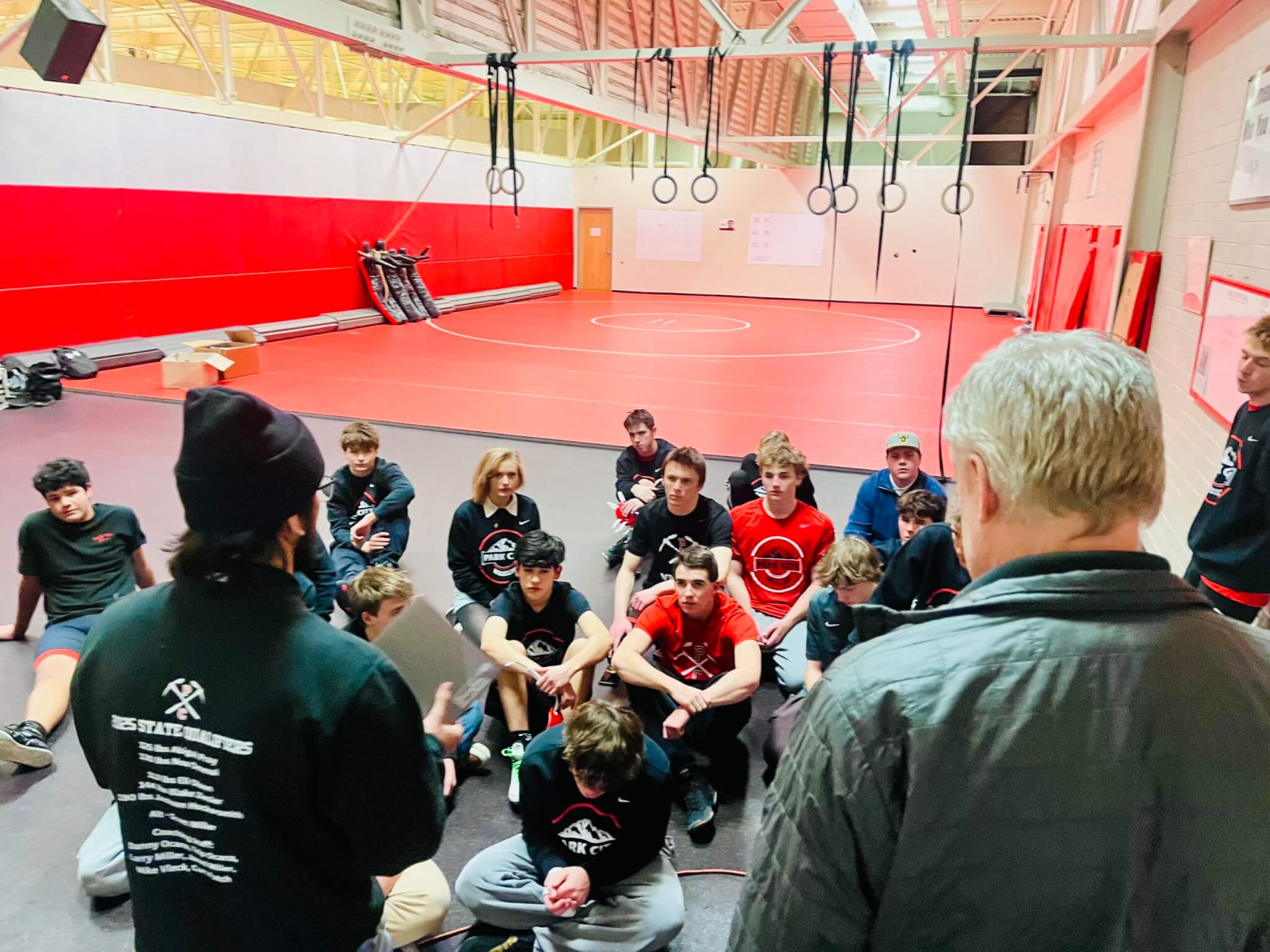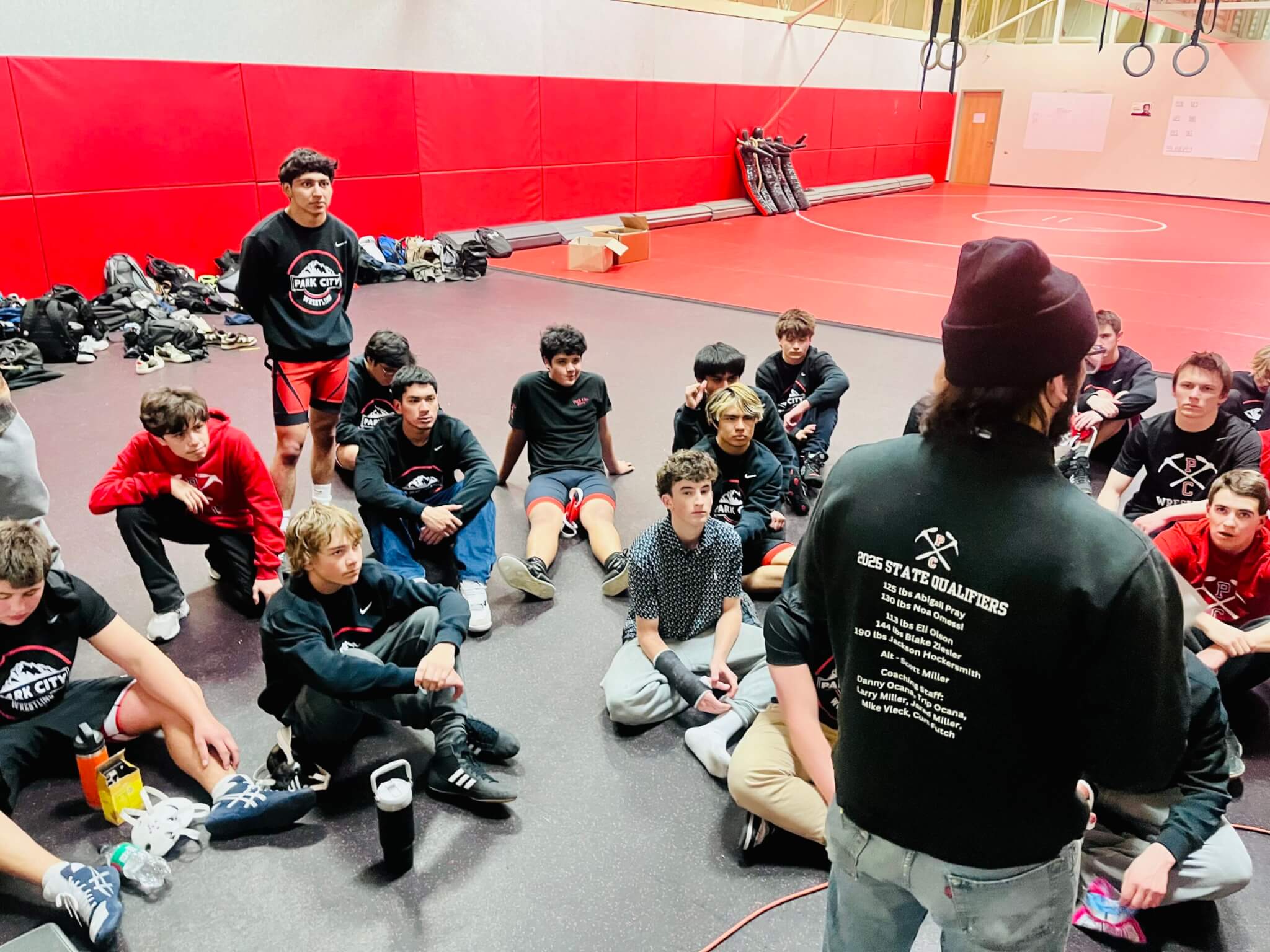 Below, Park City coaching staff Ocana and Assistant Coach Larry Miller (right) giving their junior varsity and varsity athletes a pre-game pep talk in the practice room.
