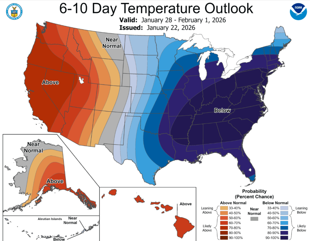 Utah’s snowpack remains well below average, with extended range outlooks indicating above normal temperatures and below average precipitation through at least the end of January while south eastern states prepare for severe winter weather