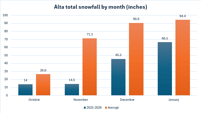 The Alta Ski Area website is reporting just 140.5” so far for October – January, or just 49.7% of normal (1980 – present); although, we still have 9 days left in January so that number may get a little better, but not by much as little snowfall is expected through the end of the month.