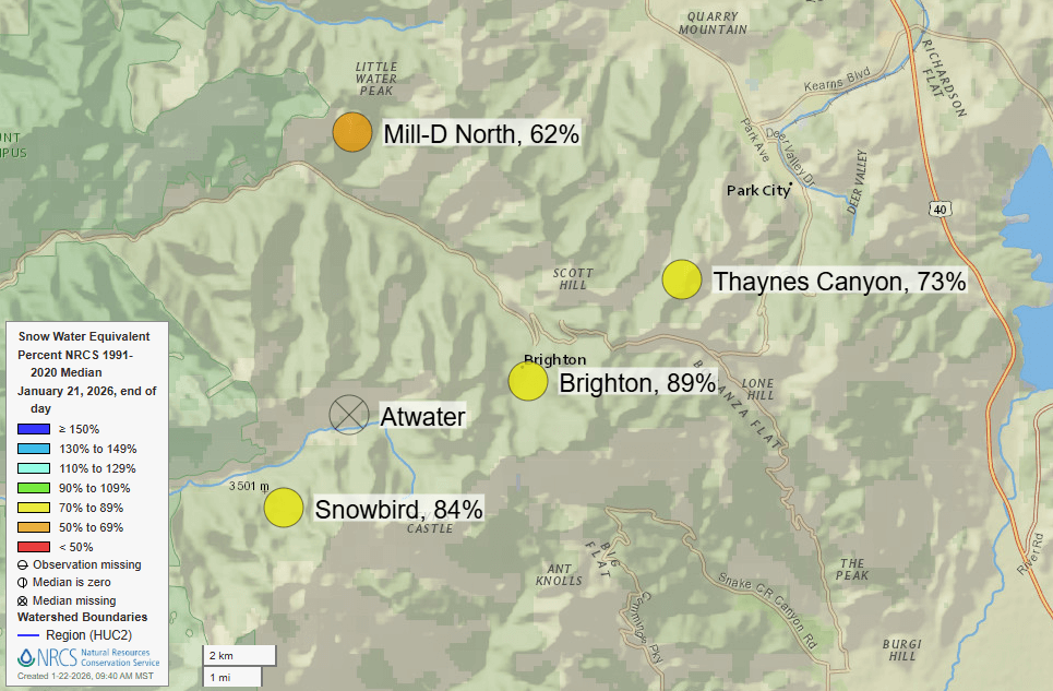 PARK CITY, Utah – As we quickly approach the end of January, Utah’s snowpack statewide sits at just 62 percent of normal compared to the most recent 30-year climatological median (1991-2020), based on data from the USDA – SNOTEL snowpack monitoring network.