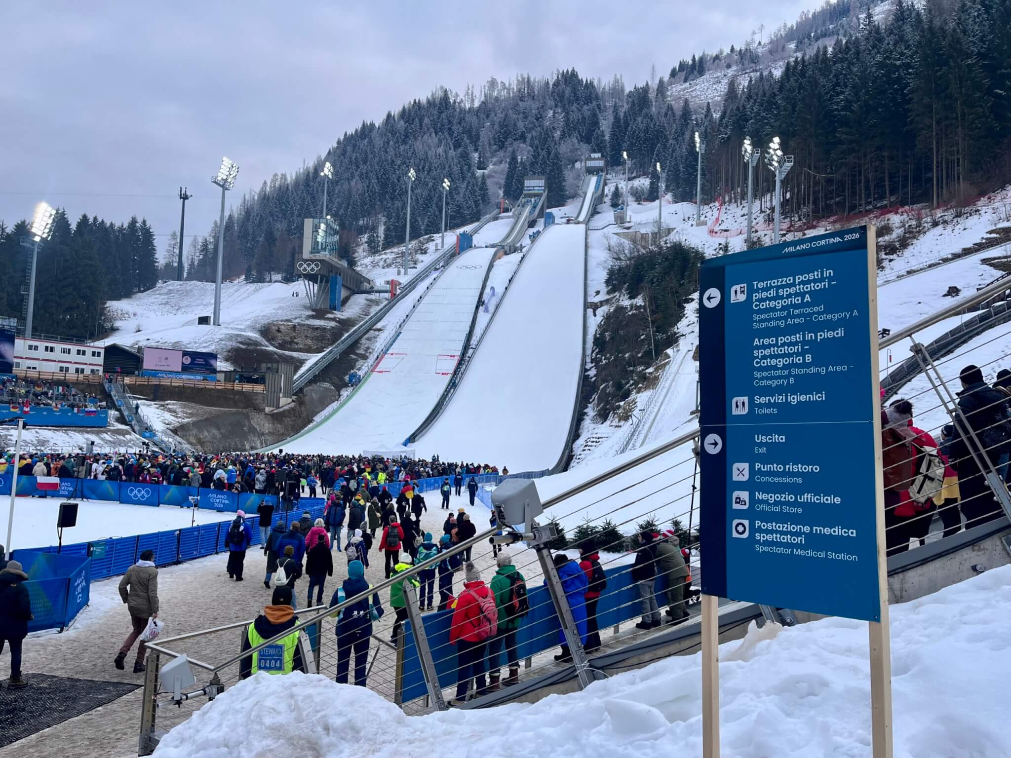 A unique facet of this Milano Cortina Venue is that there is a funicular that brings athletes up to the top, not a chairlift, gondola, or elevator as seen throughout the USA.