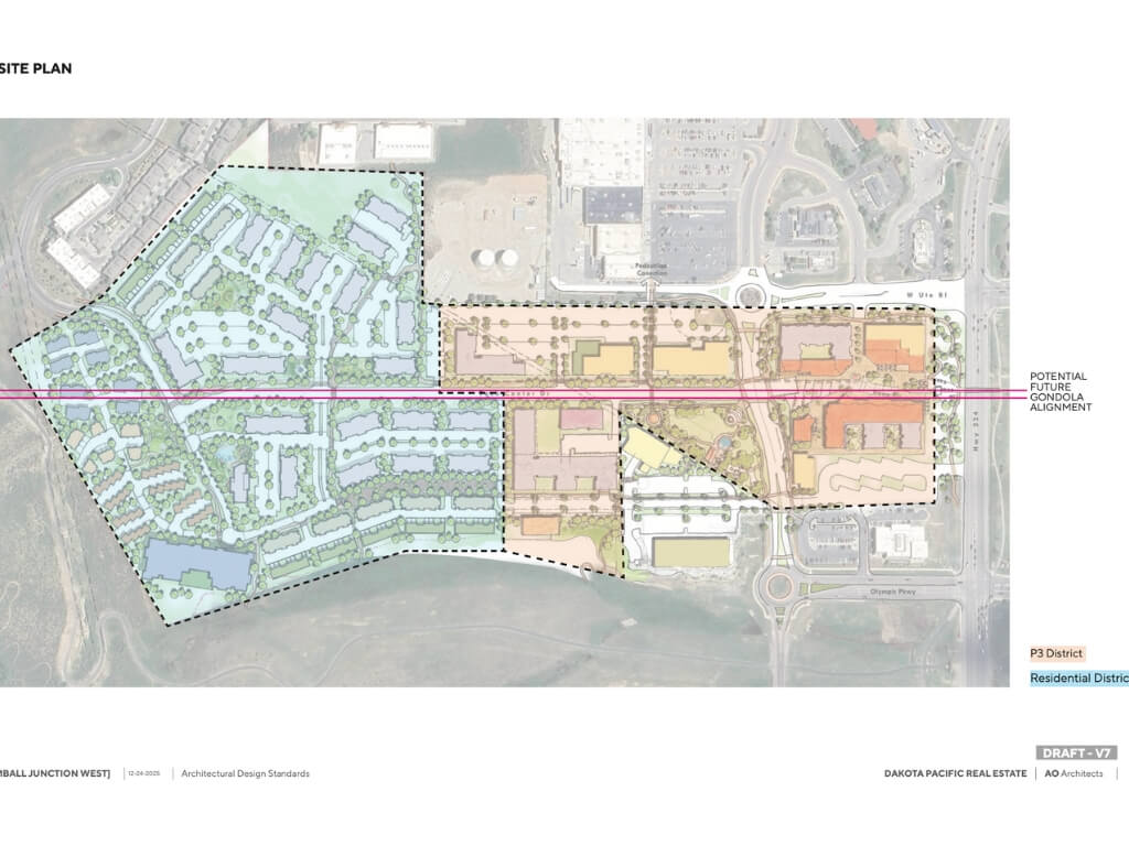 The design documents approved Monday also show how a potential future gondola system could integrate into the development, with conceptual plans depicting aerial transit cabins running east-west above Tech Center Drive. While Summit County’s 2025 development agreement with Dakota Pacific requires the developer to accommodate a gondola alignment, it does not mandate construction of the transit system.
