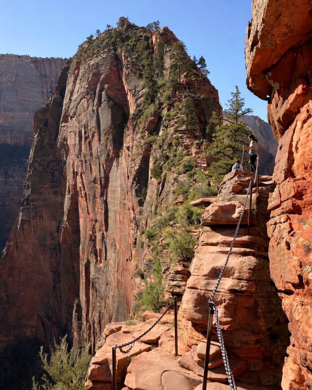 The final section of Angels Landing is accessible only by permit and follows a narrow ridge with steep drop-offs on either side, ranging from 500 to 1,000 feet. Chains are installed along the route to assist hikers.