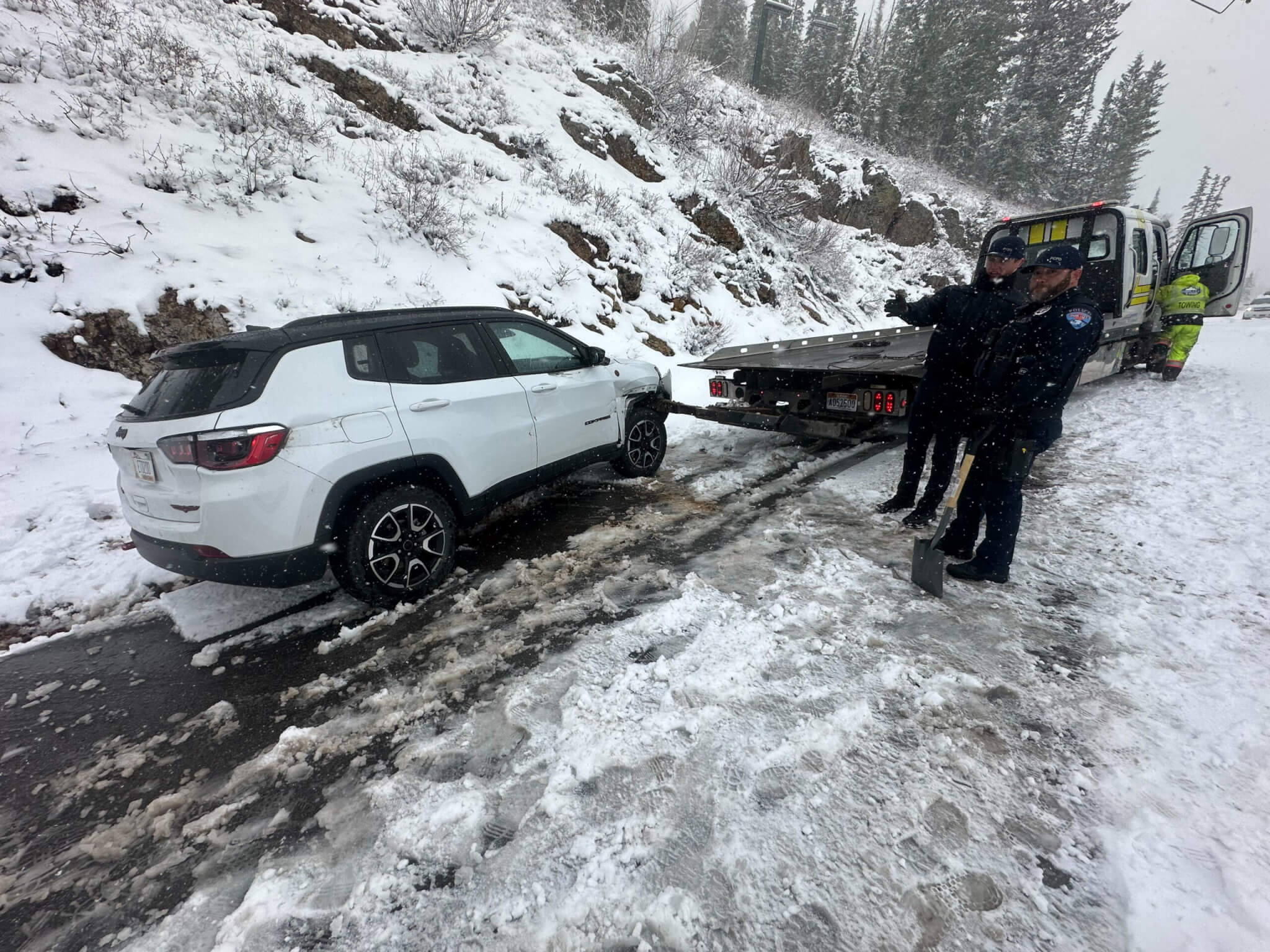 The conditions caught at least one driver out. A white Jeep Compass slid off the road on the upper section of the pass on Sunday afternoon and a tow truck was called to recover it. While maneuvering on the snow-packed pavement, the tow truck itself lost traction, slid into the Jeep it was there to recover, and came to rest blocking the road.