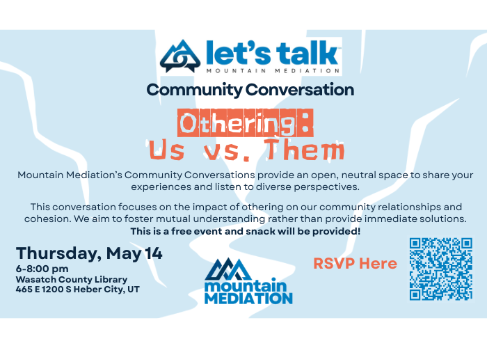 Join Mountain Mediation's Let’s Talk℠ Community Conversation - Othering: Us vs. Them. This Community Conversation provides an open, neutral ground to share experiences, listen to diverse perspectives, and discuss the impact of othering on our community relationships and cohesion, aiming to foster mutual understanding rather than provide immediate solutions. This is a free* event, and light