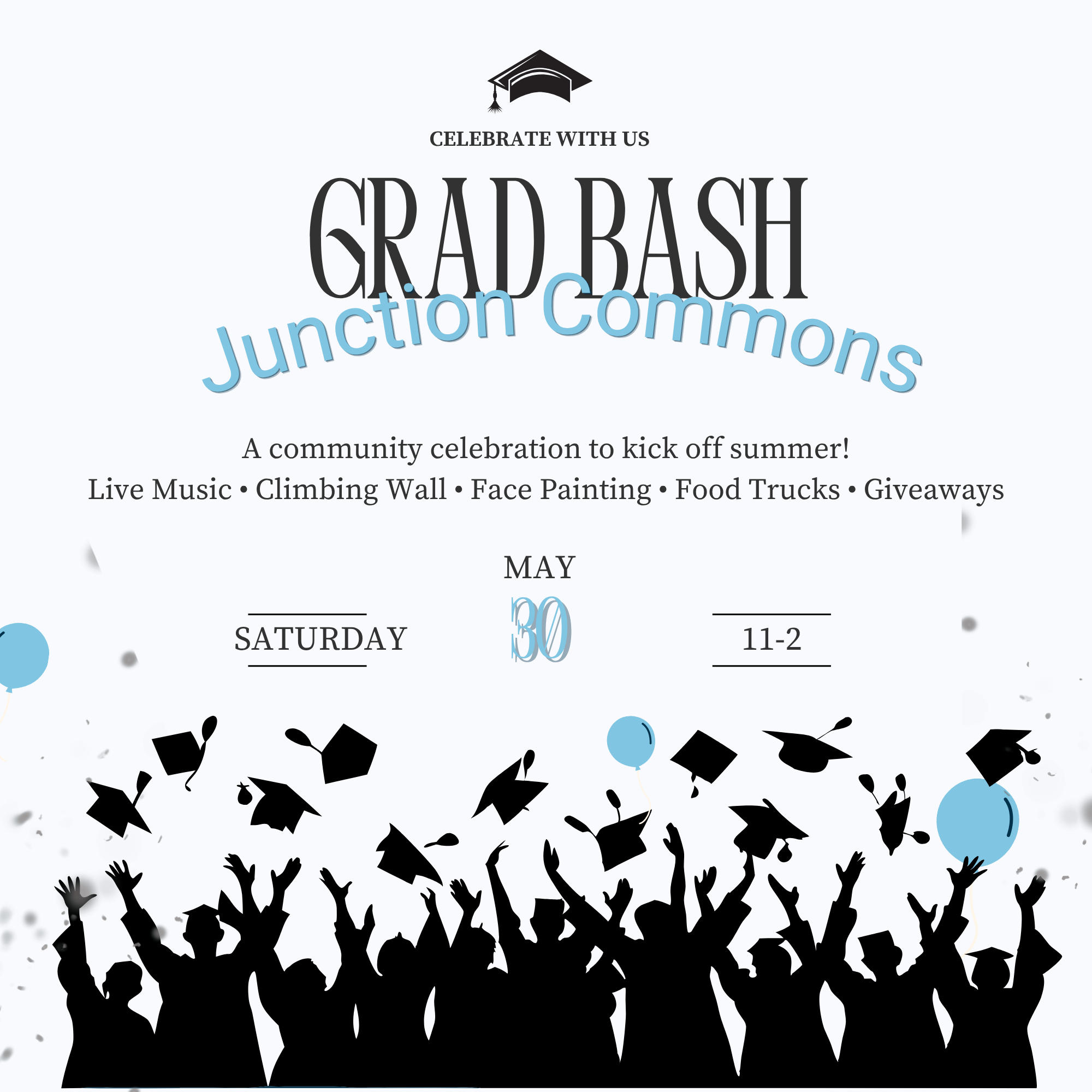 Graduation season deserves a celebration—and Junction Commons is throwing one for the whole community! Join us for an afternoon of live music, food trucks, a climbing wall, face painting, giveaways,