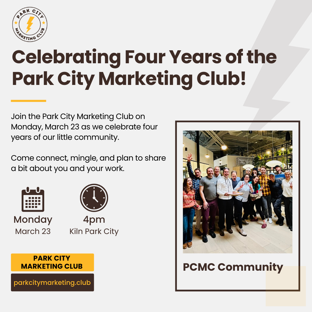 Join the Park City Marketing Club on Monday, March 23 as we celebrate four years of learning, sharing and connecting. We'll have drinks and snacks, and you'll have an opportunity to introduce yourself and your business. You can also make suggestions about event topics and speakers you'd like to see this year in the club.