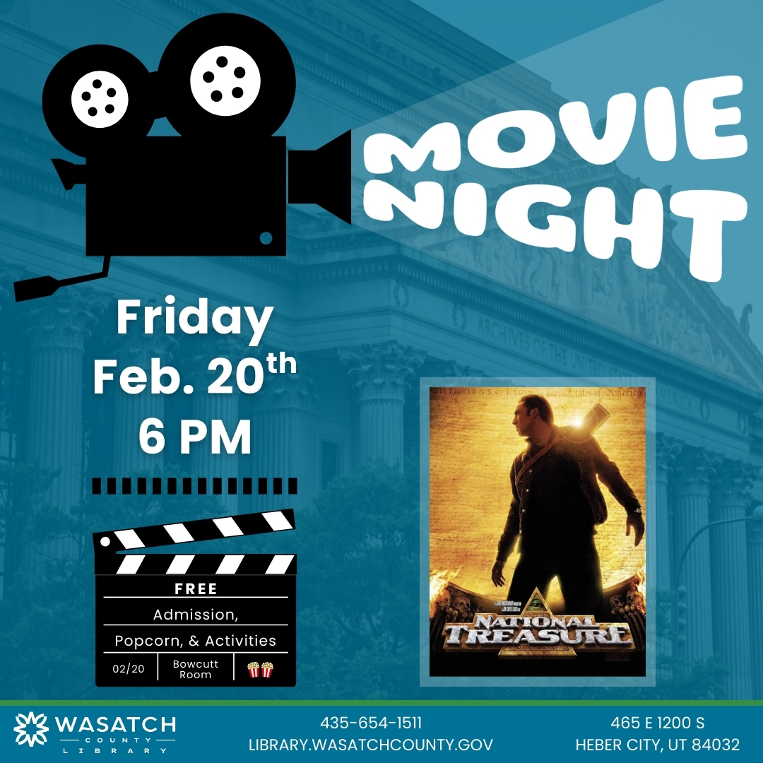 Discover the treasure of a great movie night at the library. Wasatch County Library Movie Night returns Friday, February 20th at 6 p.m. Popcorn will be provided, you bring a pillow and water bottle to be comfortable while watching this free screening of National Treasure! In honor of America250, Wasatch County Library plans to show